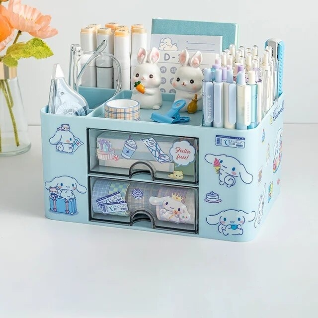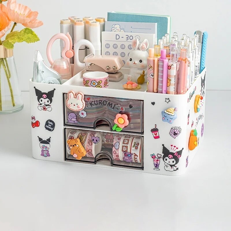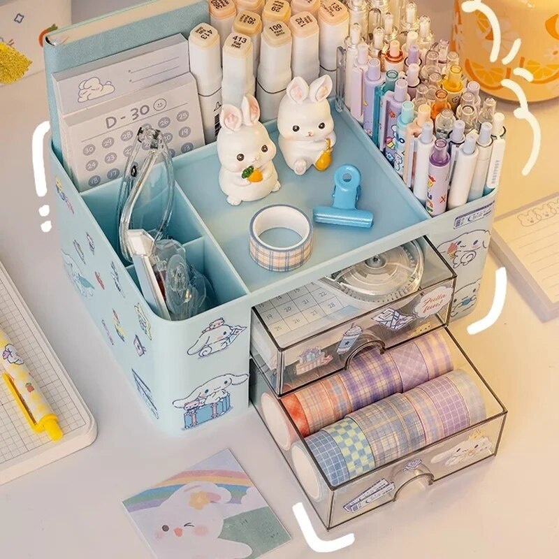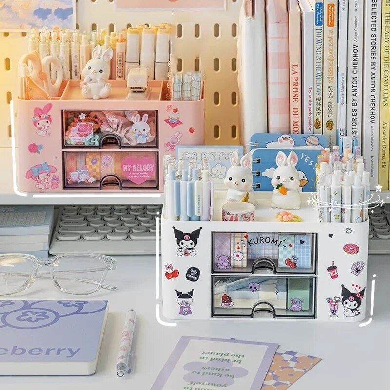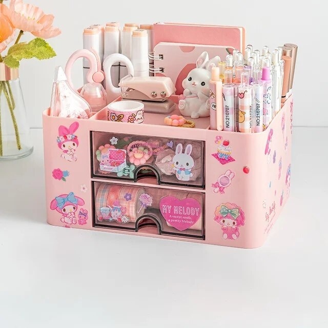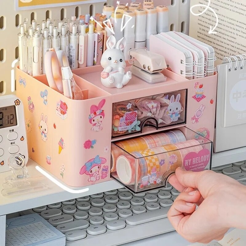 Pink drawer storage box for desk organization and stationery arrangement