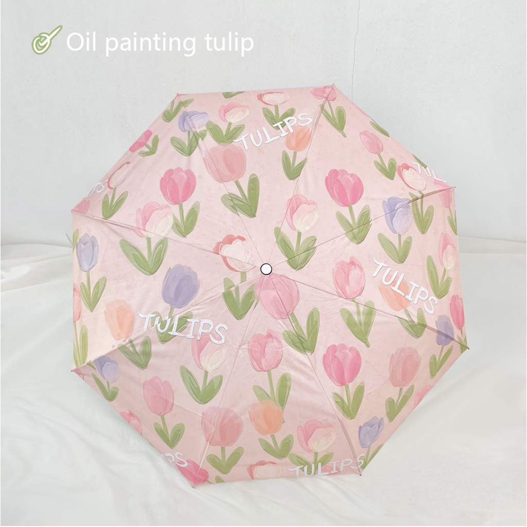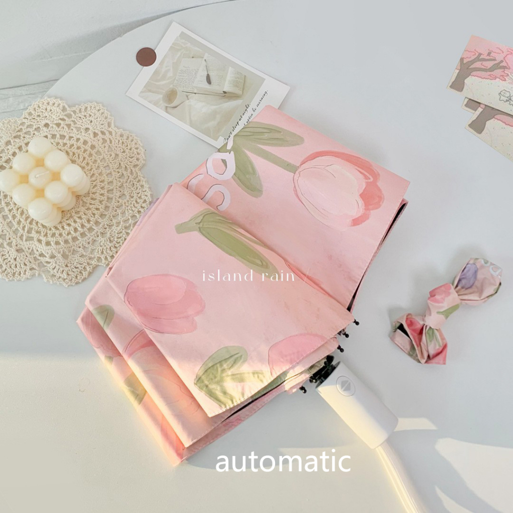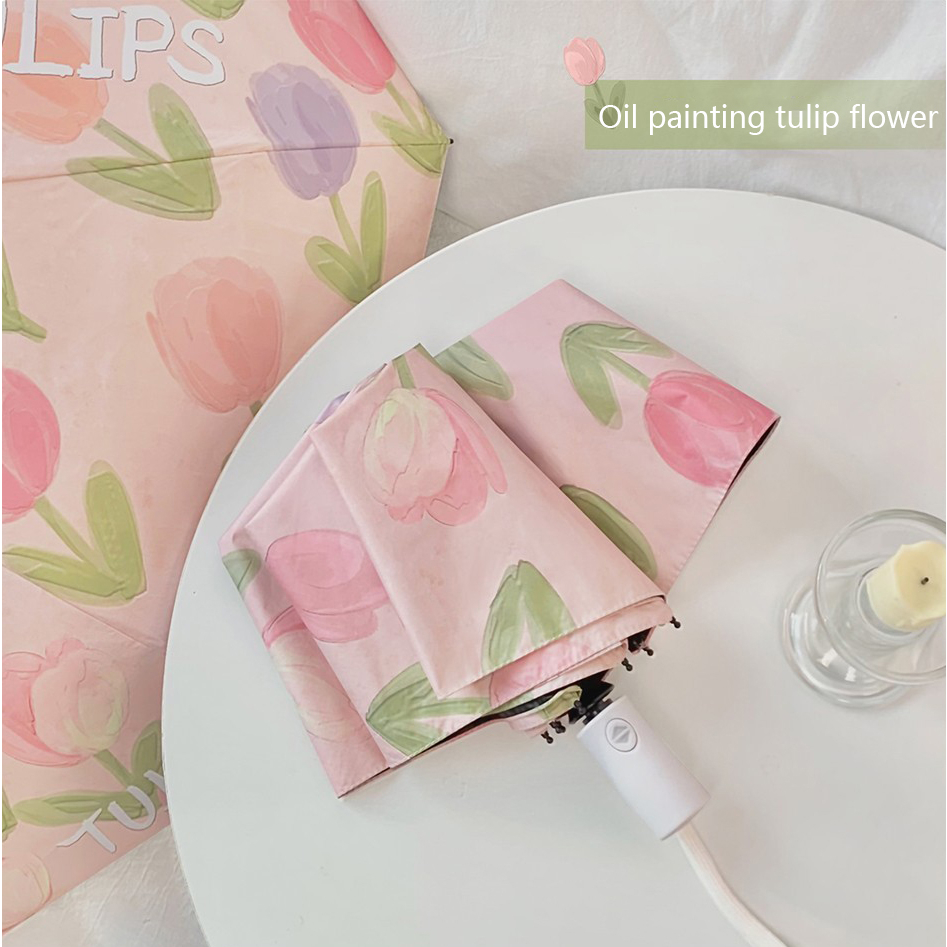 Pink tulip flower umbrella Portable folding automatic umbrella Outdoor UV prevention