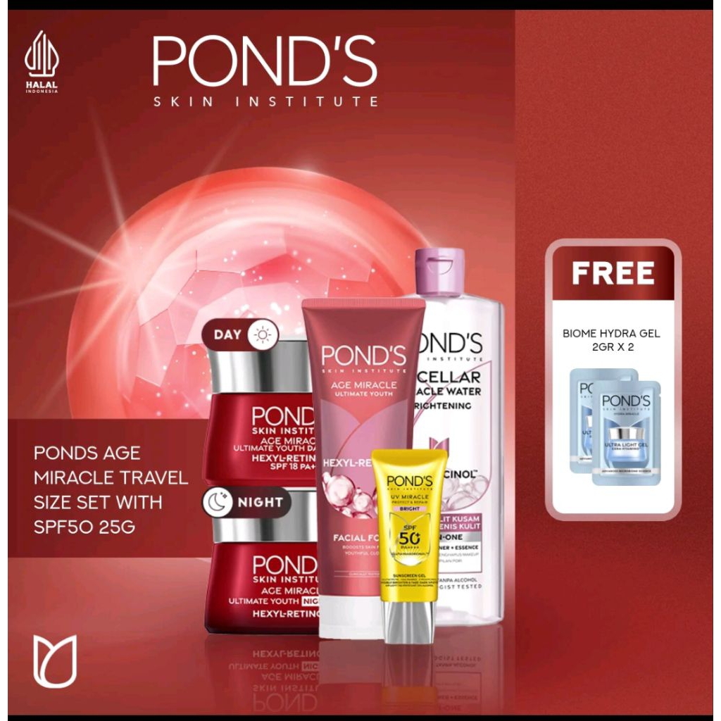 PACKAGE Ponds AGE MIRACLE DAY CREAM 9 GR + NIGHT CREAM 9 GR + FACIAL FOAM 100 GR + MICELLAR WATER 100 GR + HYDRATE SPF 50 25 GR FREE BIOME HYDRA GEL 2GR X 2
