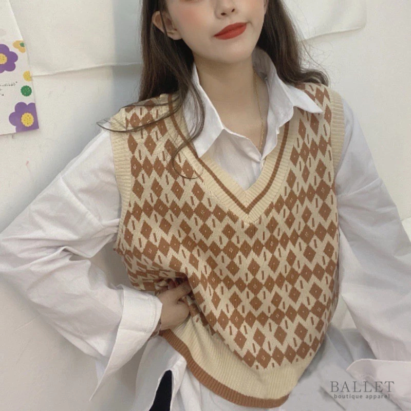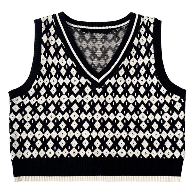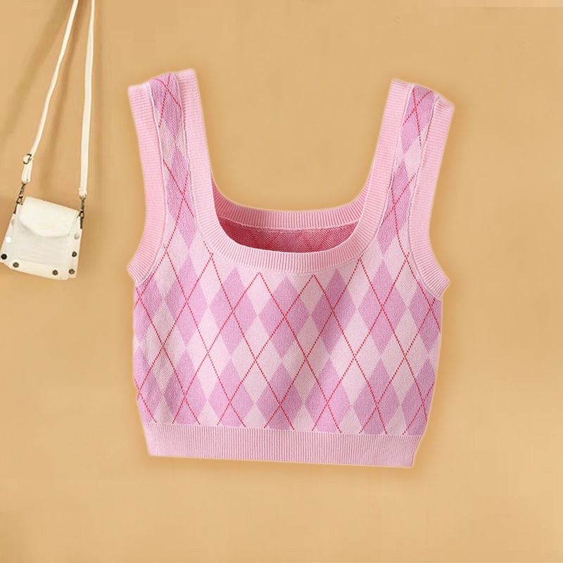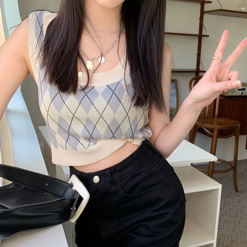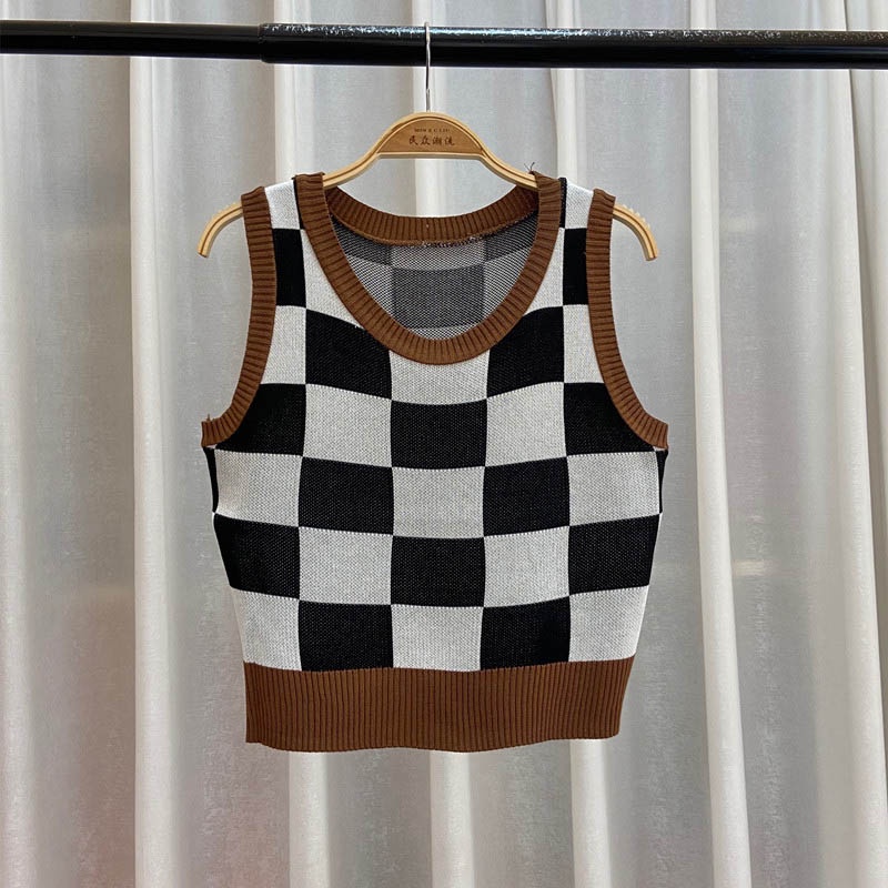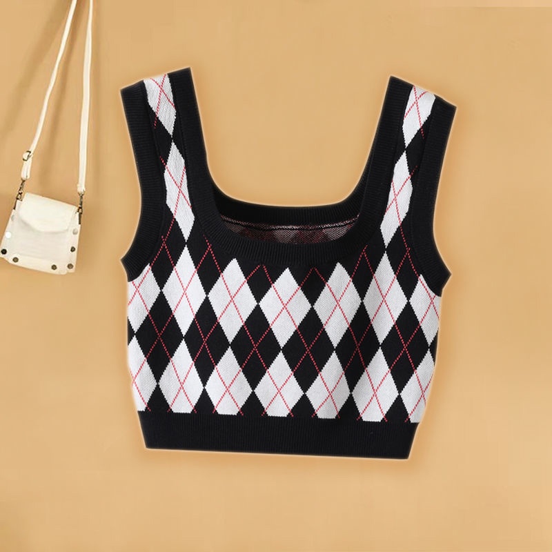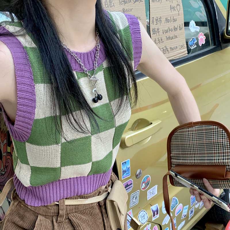 Plaid Knitted sweater Vest Korean Women's V-Neck Sleeveless Oversized Camisole Tops BB