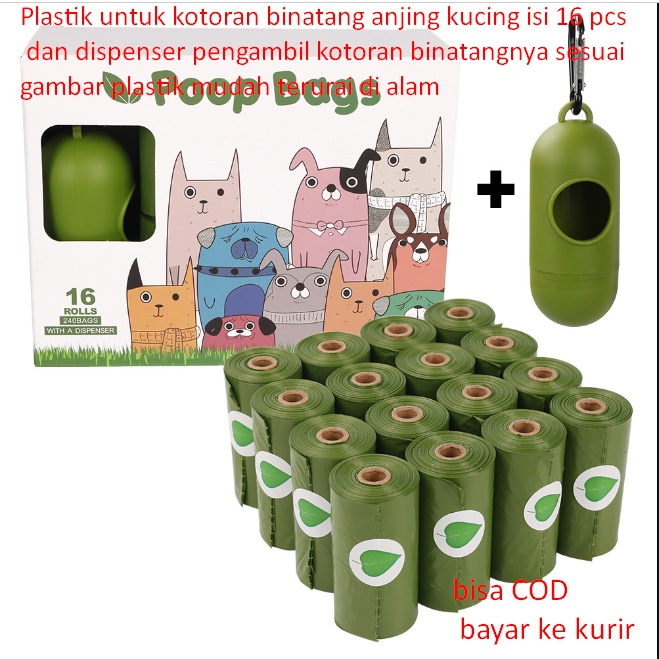 Plastic for dog and cat animal waste contains 16 pcs and the animal waste pick-up dispenser is according to the picture. The plastic is easily decomposed in nature