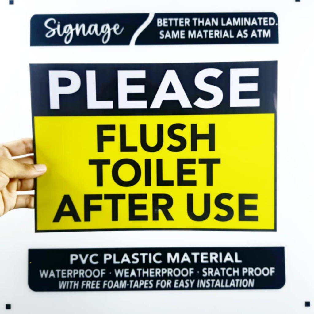 SIGNAGE - PLEASE FLUSH TOILET AFTER USE - YELLOW - PVC PLASTIC MATERIAL SIGNAGE