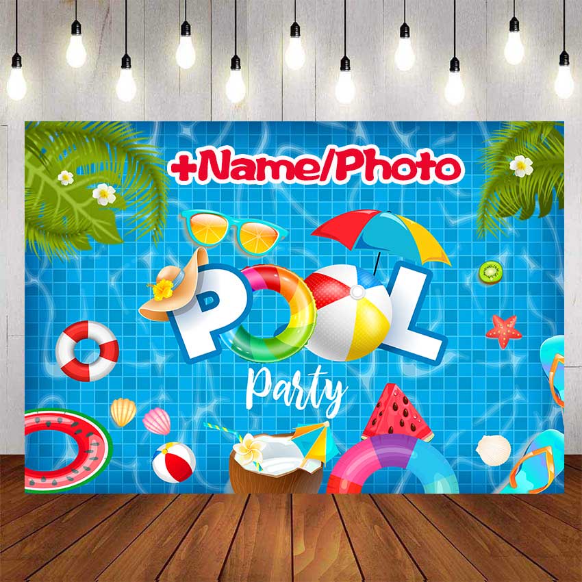 Pool Party Summer Birthday Backdrop For Photography Baby Shower Kids Children Girls Boys Blue Background Birthday Party Decor Custom Name Photo