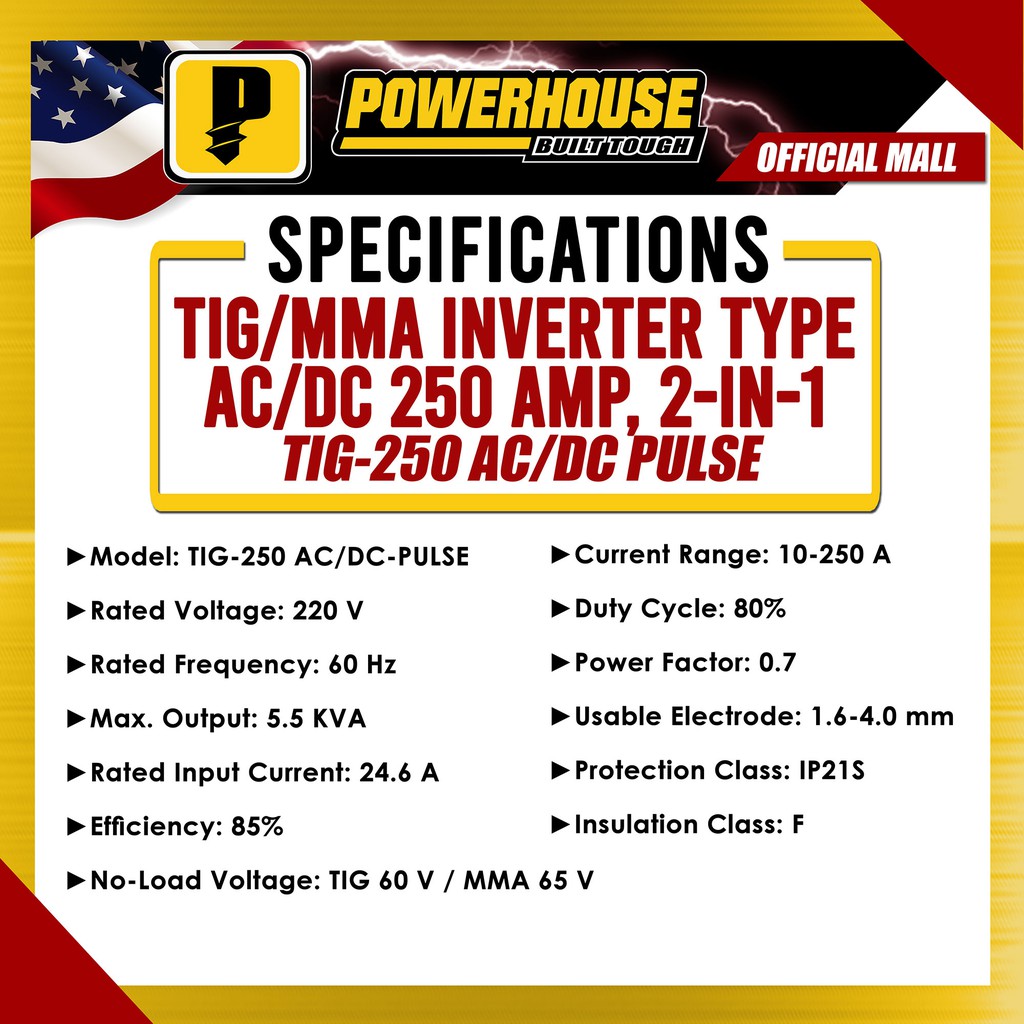 Powerhouse 250A Ac-Dc Tig/Mma 2 In 1 Pulse Series Inverter Welding Machine Tig-250 Ac/Dc-Pulse PHWM