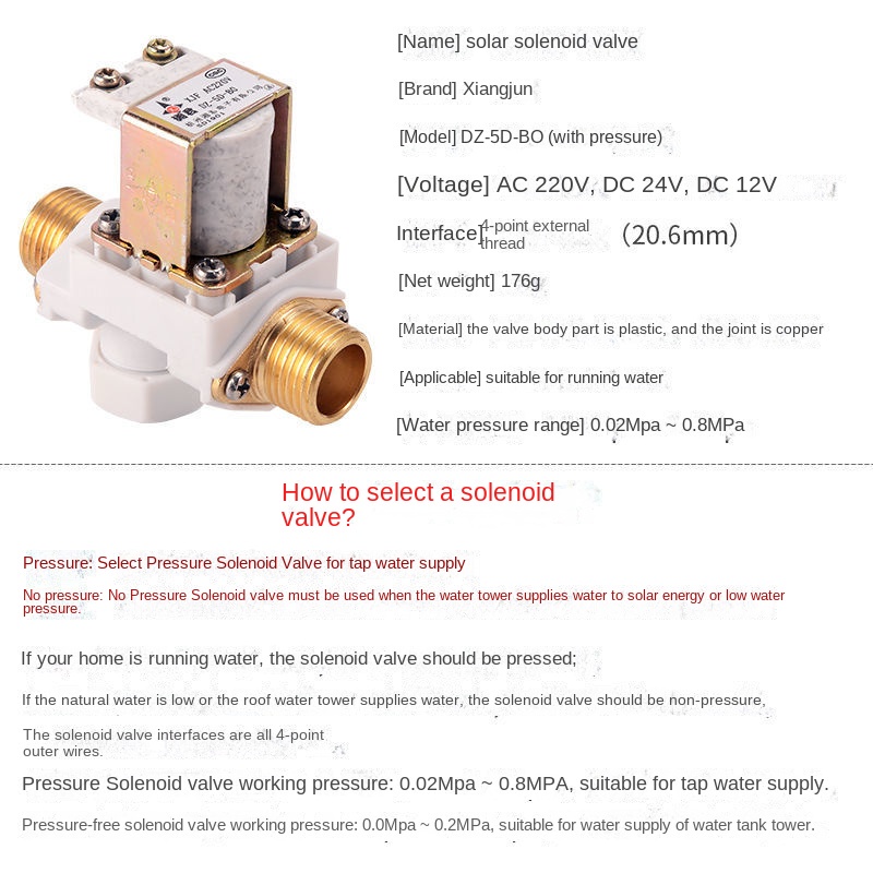 Pressurized Solar Water Heater Inlet Solenoid Valve DZ-5D-BO AC/DC DC/AC/220v24v12v/Solar Water Heater Automatic Control Valve Level Inlet Stop Replenishment Tank