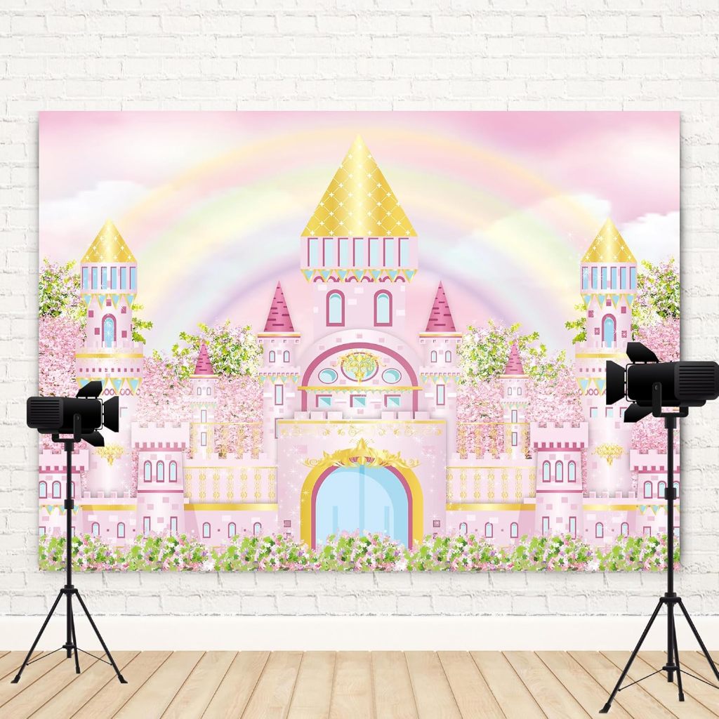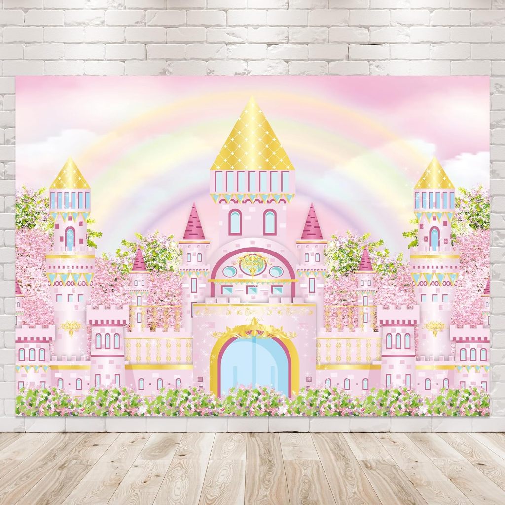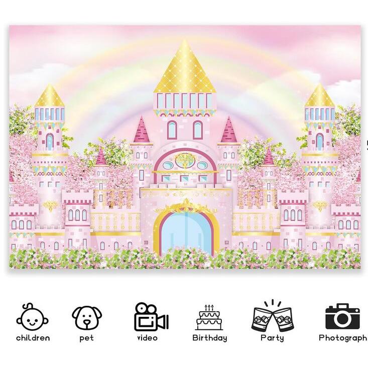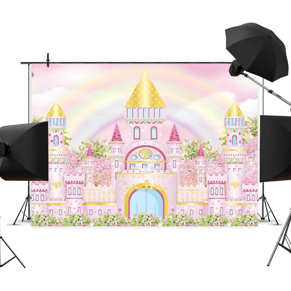 Princess Castle Photography Backdrop Girls Birthday Pink Pastel Watercolor Fairy Tale Rainbow Background Flower Cherry Blossom Plant Party Decorations Photo Booth Props Supplies