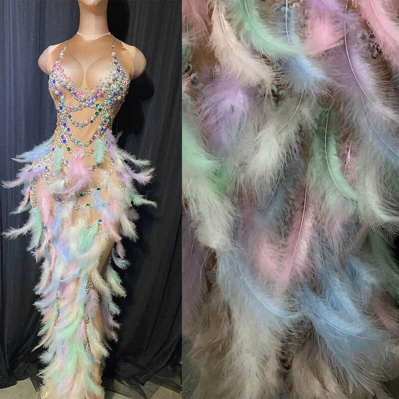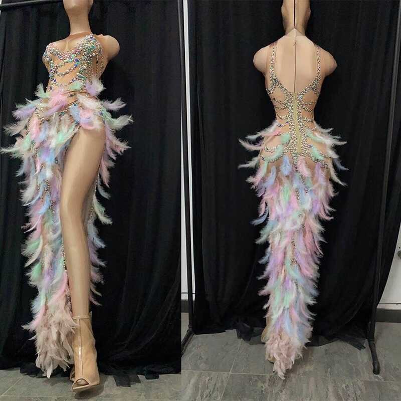 Print Sparkly Feather Long Dress Drag Queen Costume Prom Birthday Celebrate Sexy Outfit Stage Wear