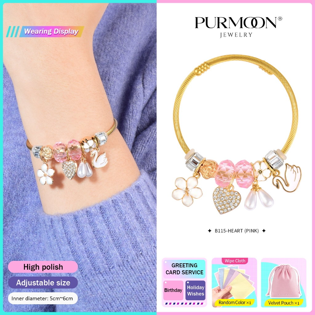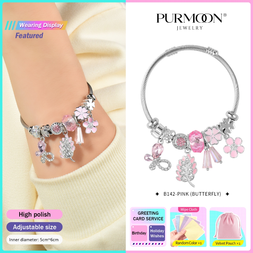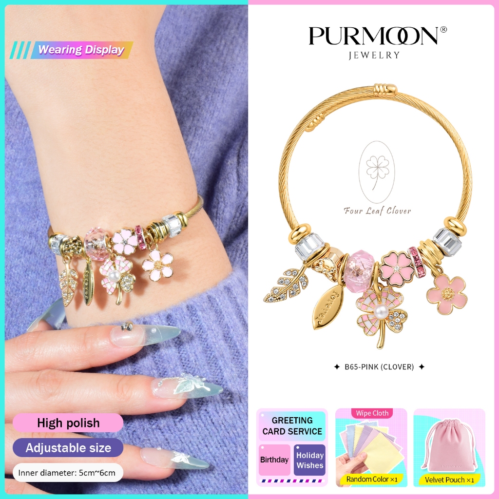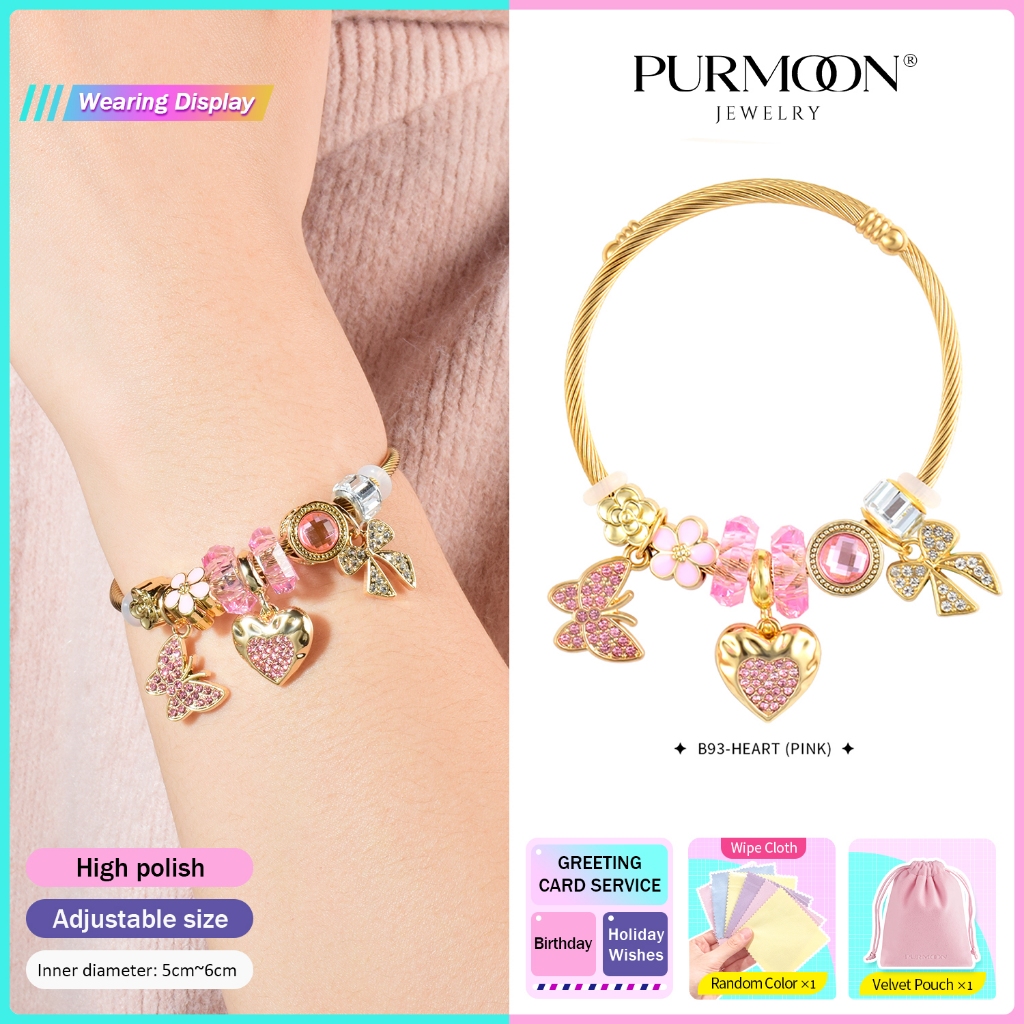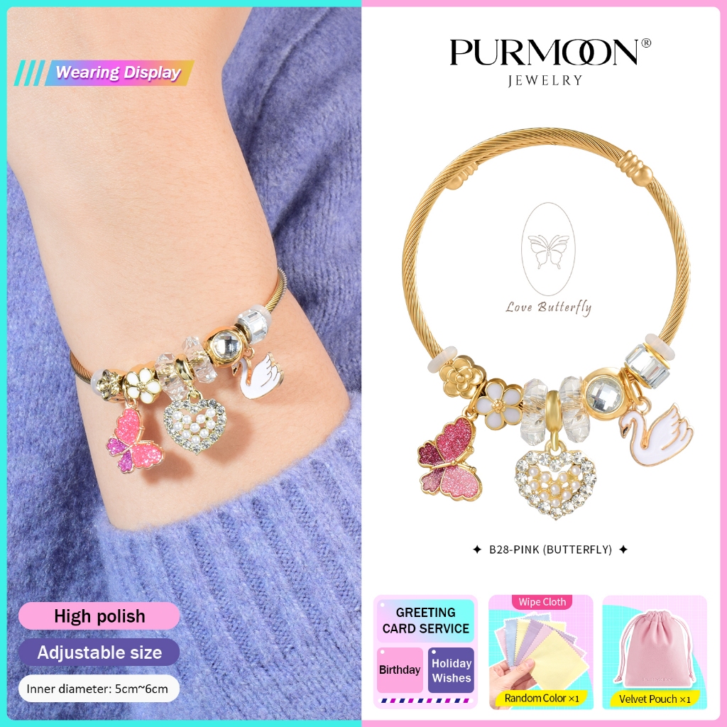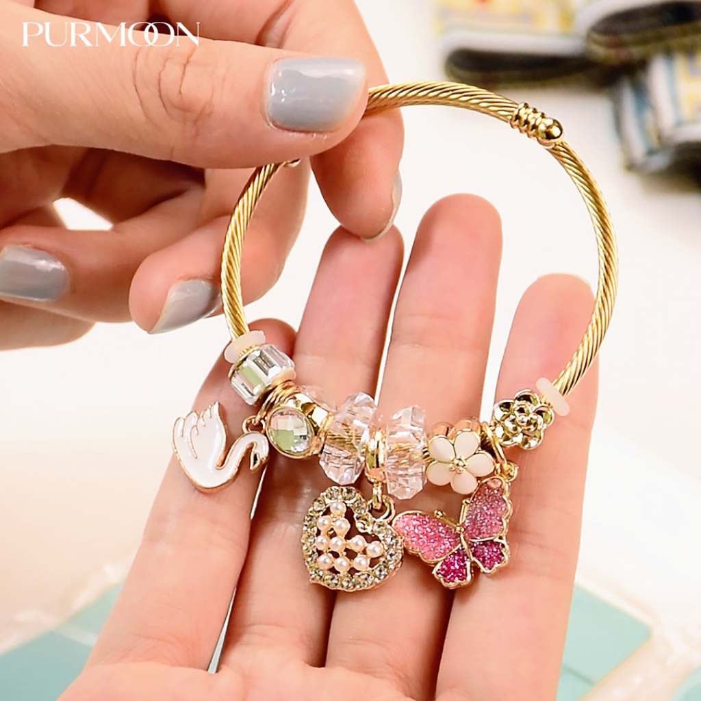 Purmoon Cystal Gold Plated Flower And Butterfly Charm Bangle Bracelet For Women Fashion Lucky Bracelet Jewelry