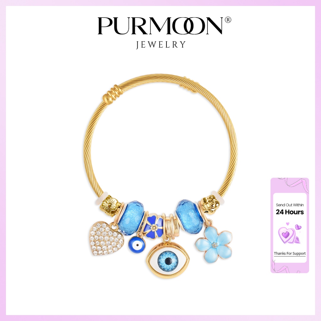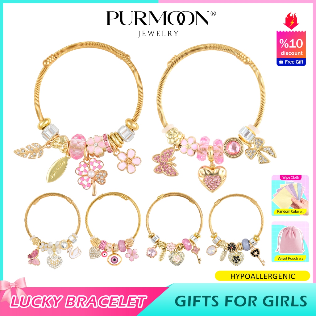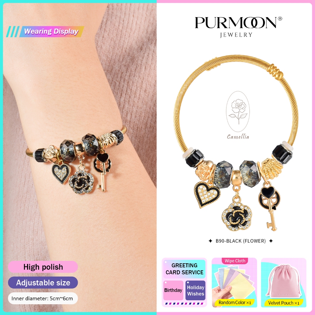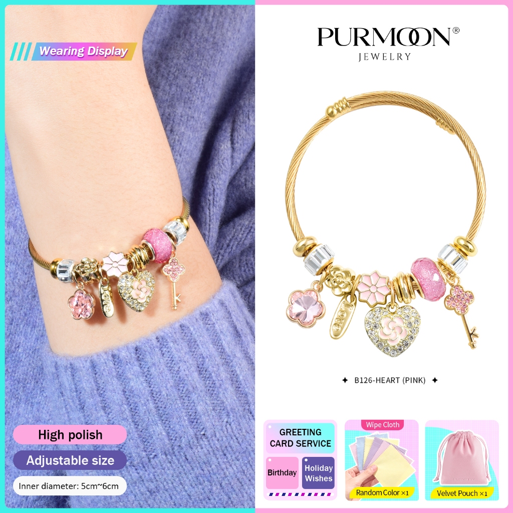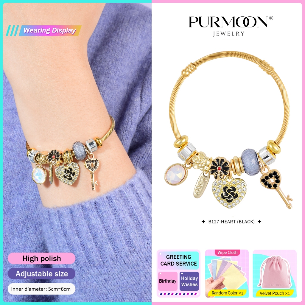 Purmoon Cystal Gold Plated Flower And Butterfly Charm Bangle Bracelet For Women Fashion Lucky Bracelet Jewelry