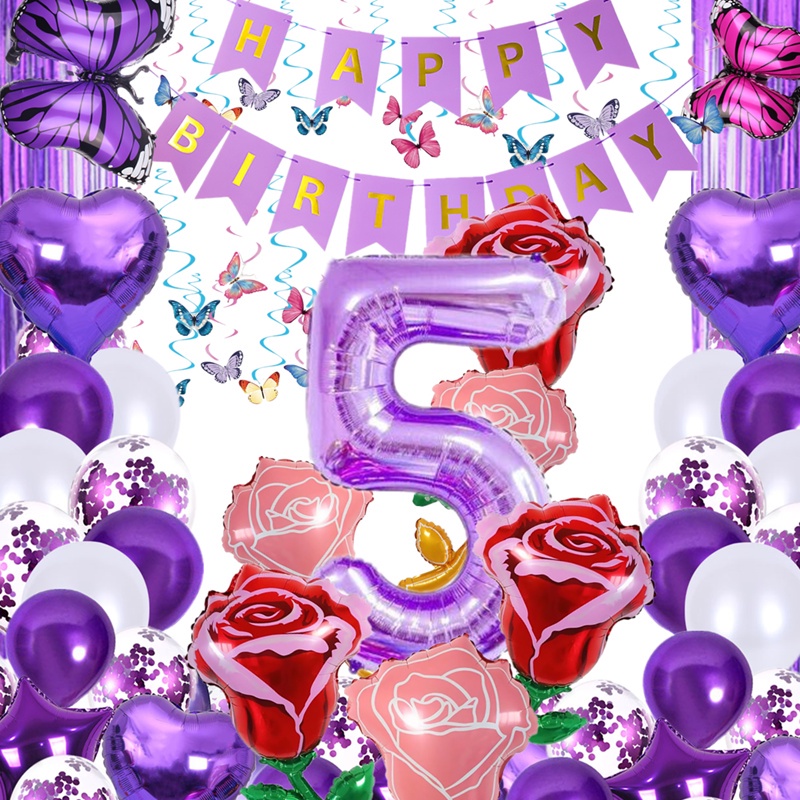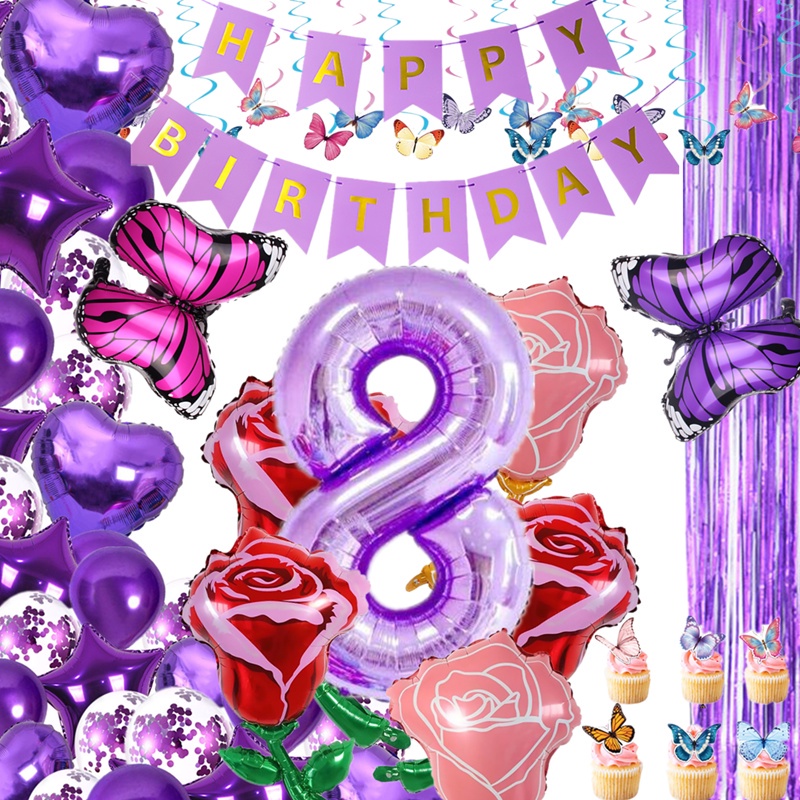 Purple Butterfly Theme Birthday party Curtain Background Cake Topper Banner Tassel Sequin Balloon Wedding Birthdays Happy Party Decors Supplie