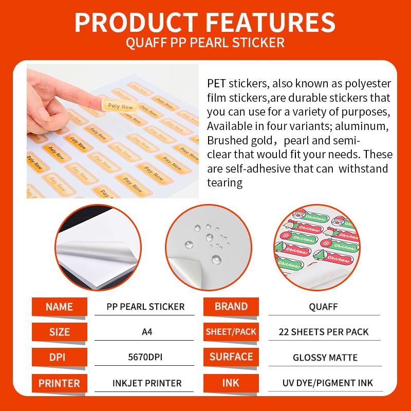 Quaff Pearl Glossy Sticker A4 Printable Inkjet Label Sticker 180gsm 22pcs Waterproof Vinyl Sticker
