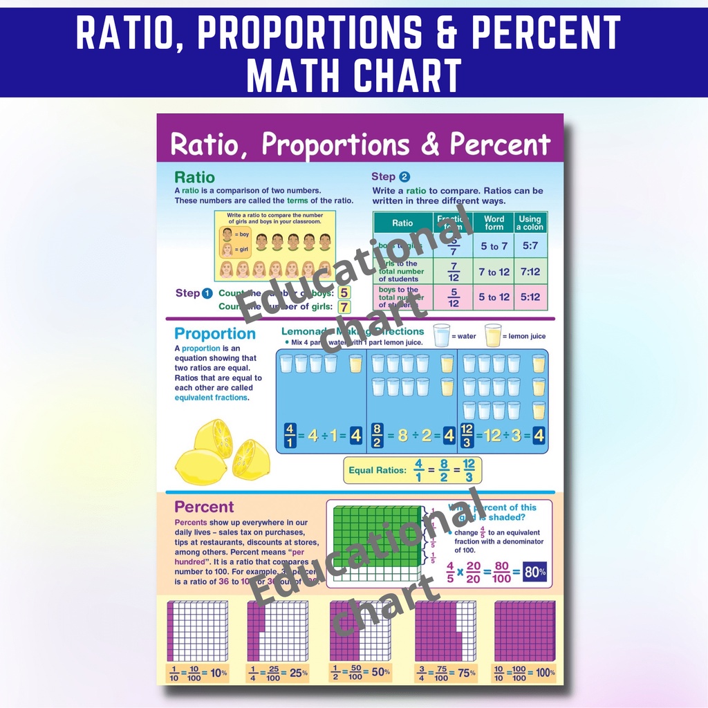 RATIO PROPORTIONS PERCENT CHARTS laminated math Charts A4 size for kids students