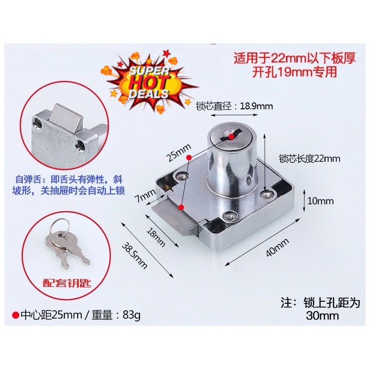 READY STOCK Heavy Duty Square Size 22mm Automatic Drawer Lock DL-338