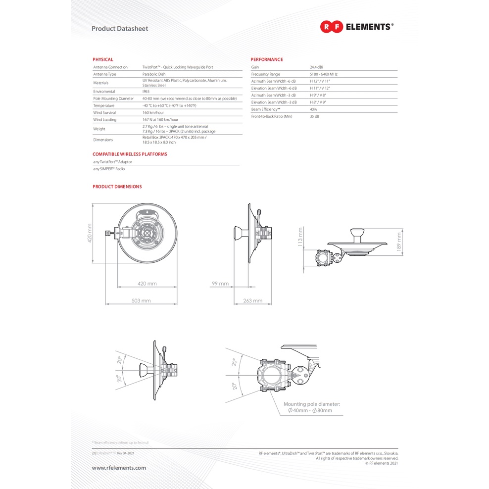 RF elements 24 dBi Ultradish - Noise-Rejecting Parabolic PTP Dish Antenna - RFe UD-TP-24 Twistport
