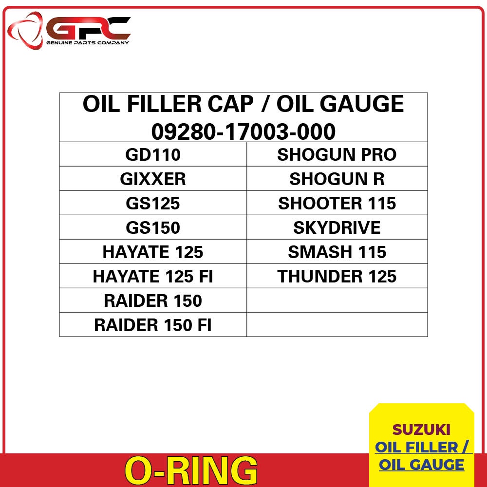 Raider 150/FI, Gixxer, Shooter, Smash, Skydrive, Raider-J 110/115, GD110 Oil Filler Cap GPC O-Ring