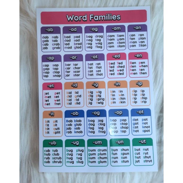 Reading Chart for Kids - Kindergarten Word Families Laminated A4 Size