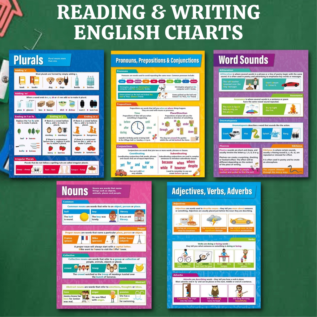 Reading and Writing Charts, English Educational Laminated Charts Wall Charts for kids, A4 Size