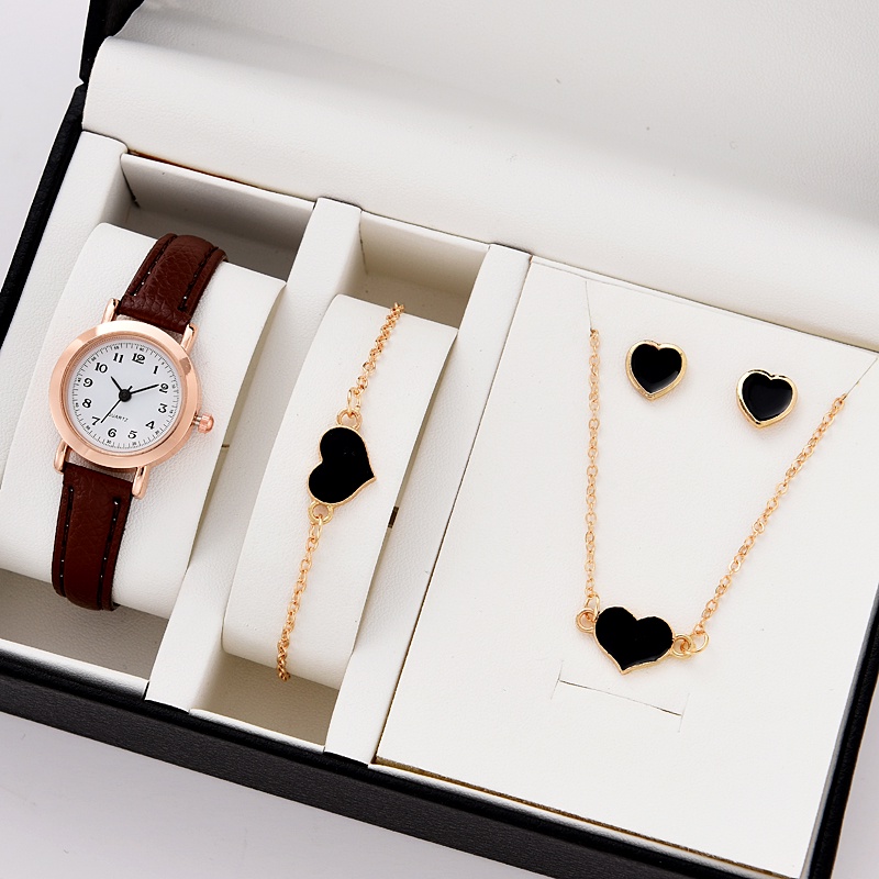 Women's Small Dial Watch & Heart Jewelry Set - Round Leather Strap Quartz Timepiece for Students