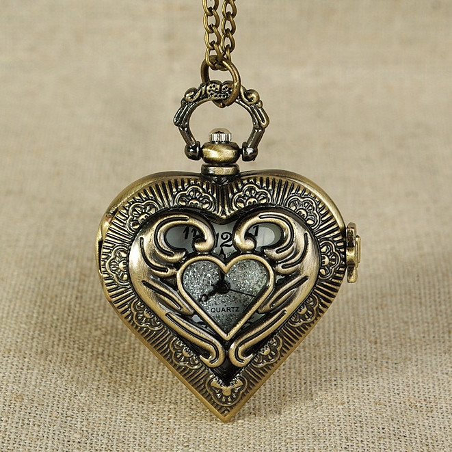 Retro Bronze Heart Shape Design Pendant Quartz Pocket Watch with Necklace