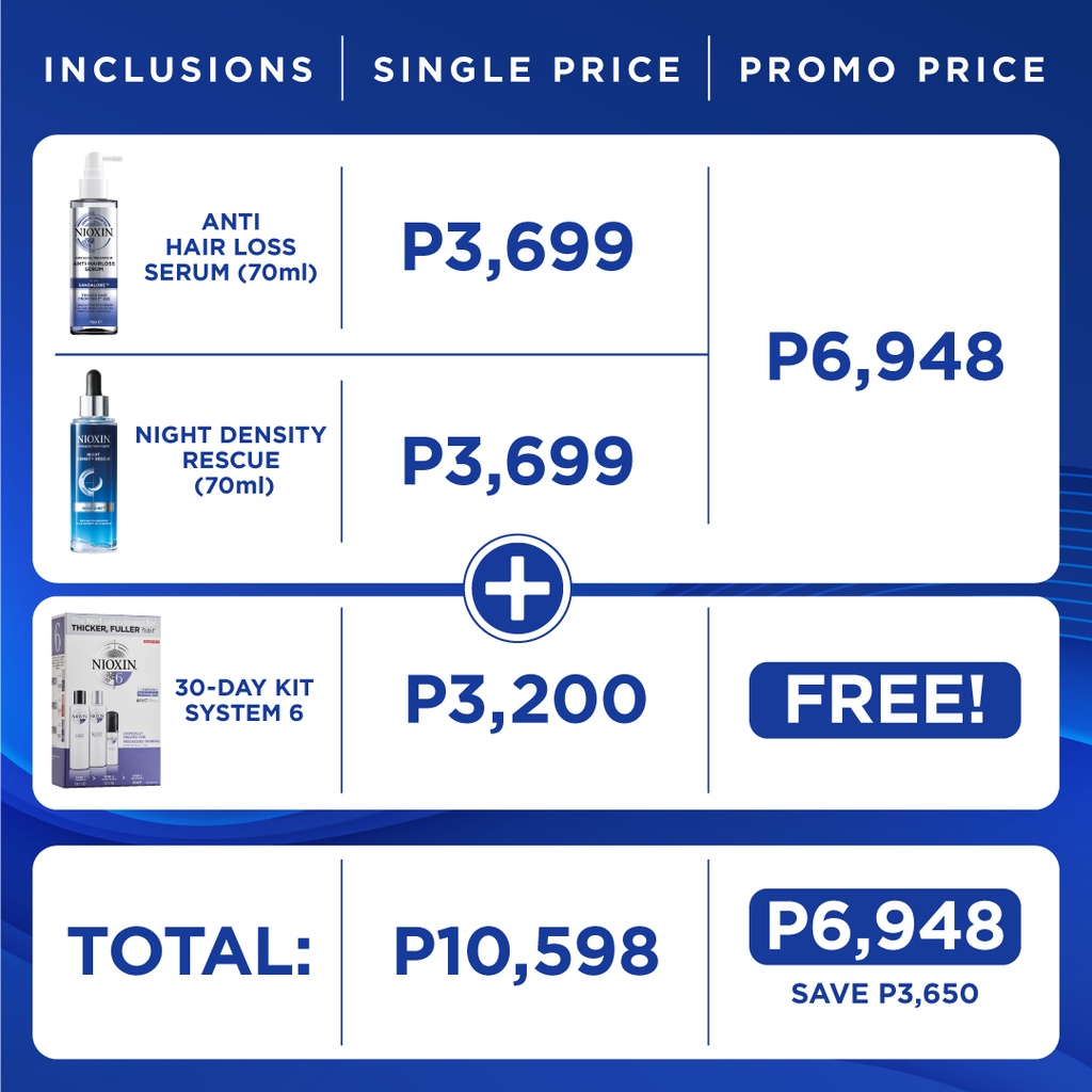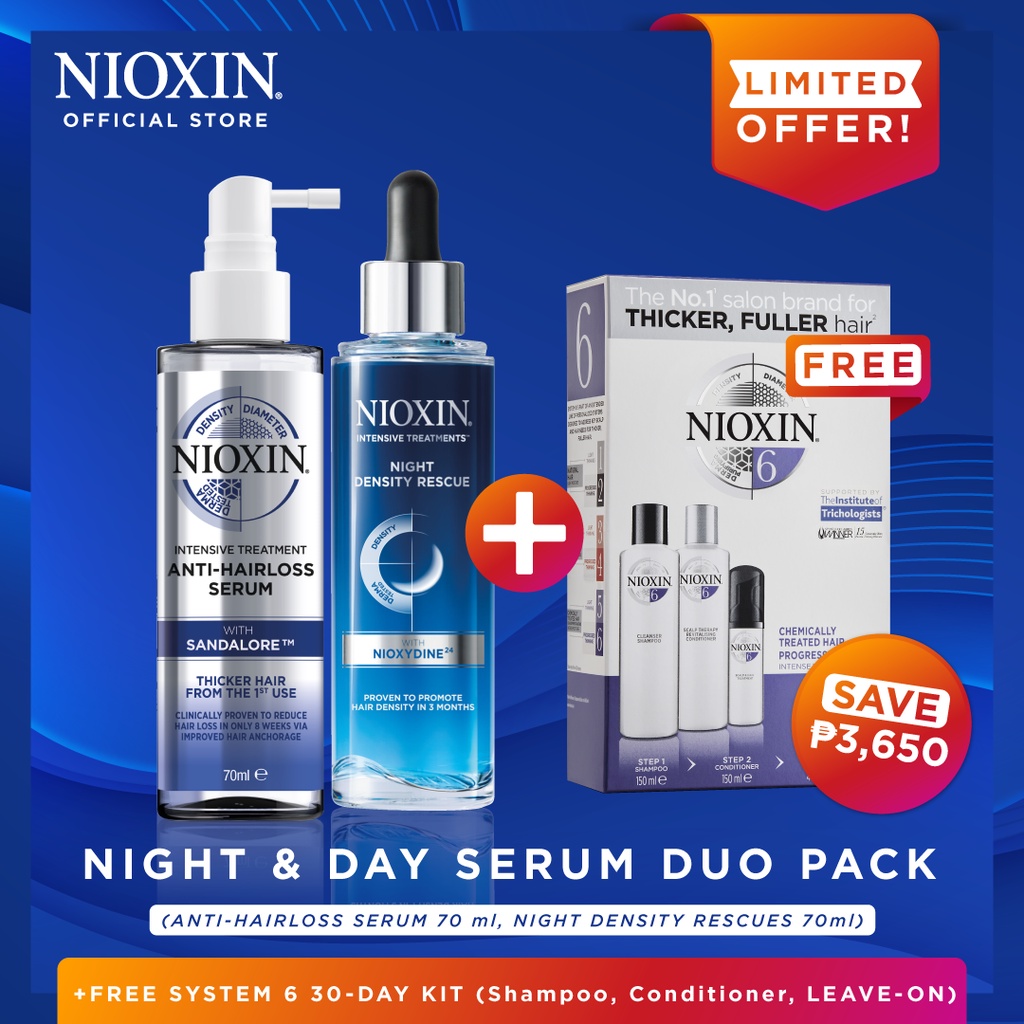NIOXIN DAY & NIGHT SERUM DUO PACK W/ FREE SYSTEM 6 KIT (Shampoo 150ML, Conditioner 150ml, Leave-On