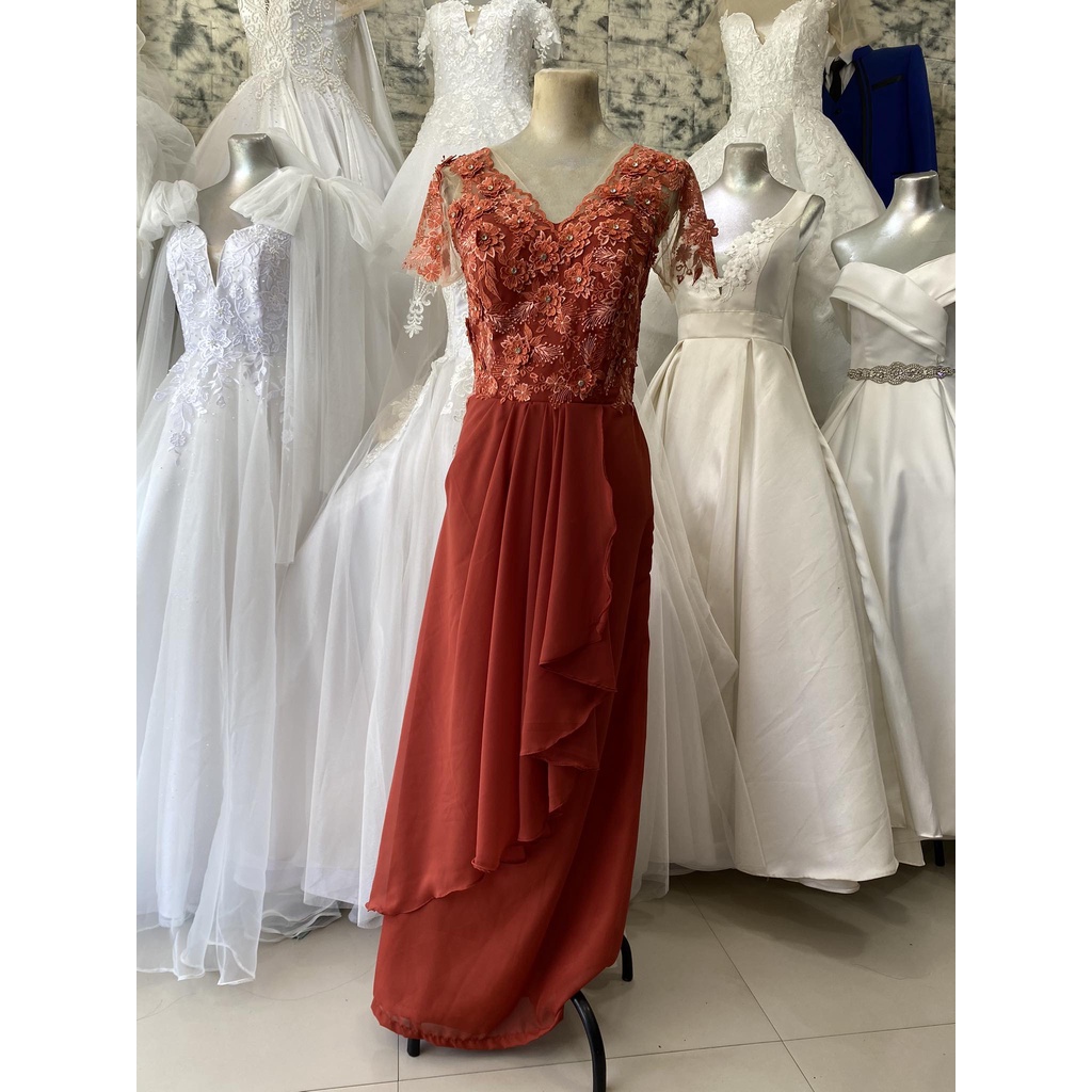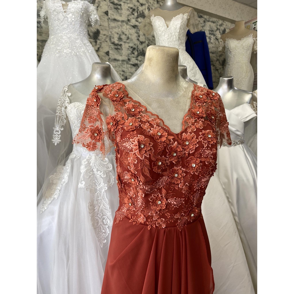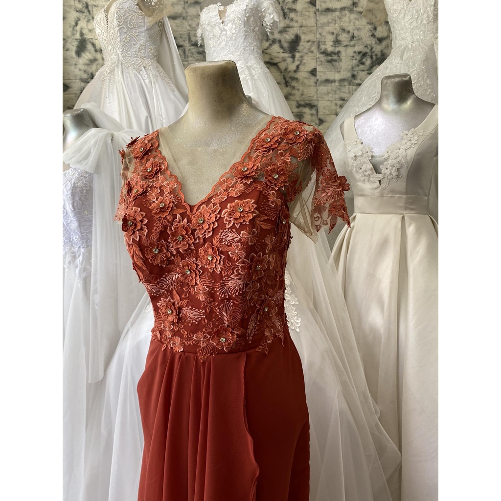 Rust Orange Laced Chiffon Long Gown