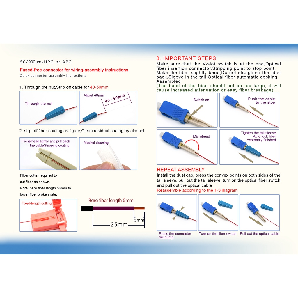 SC UPC Fiber Optic Fast Connector Fiber Quick Connectors Single Mode 900 Micron Cable Mechanical Fast Connectors Adapter for 0.9mm/2.0mm/3.0mm yellow Fiber Cable