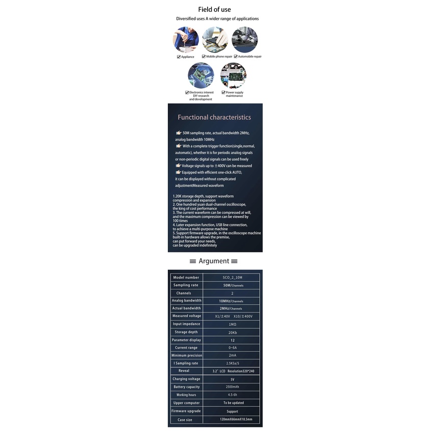 SCO2 Dual Channel Digital Oscilloscope 50M Sampling Rate 10MSa/S Analog Bandwidth One Key AUTO
