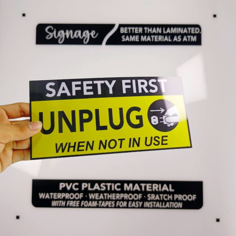 SIGNAGE - SAFETY FIRST - UNPLUG WHEN NOT IN USE - PVC PLASTIC MATERIAL SIGNAGE