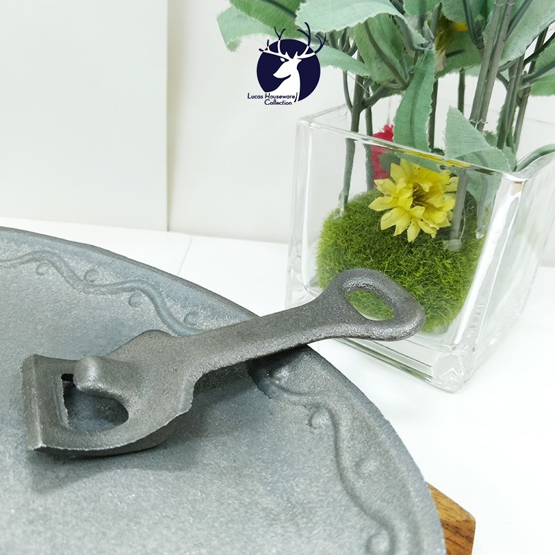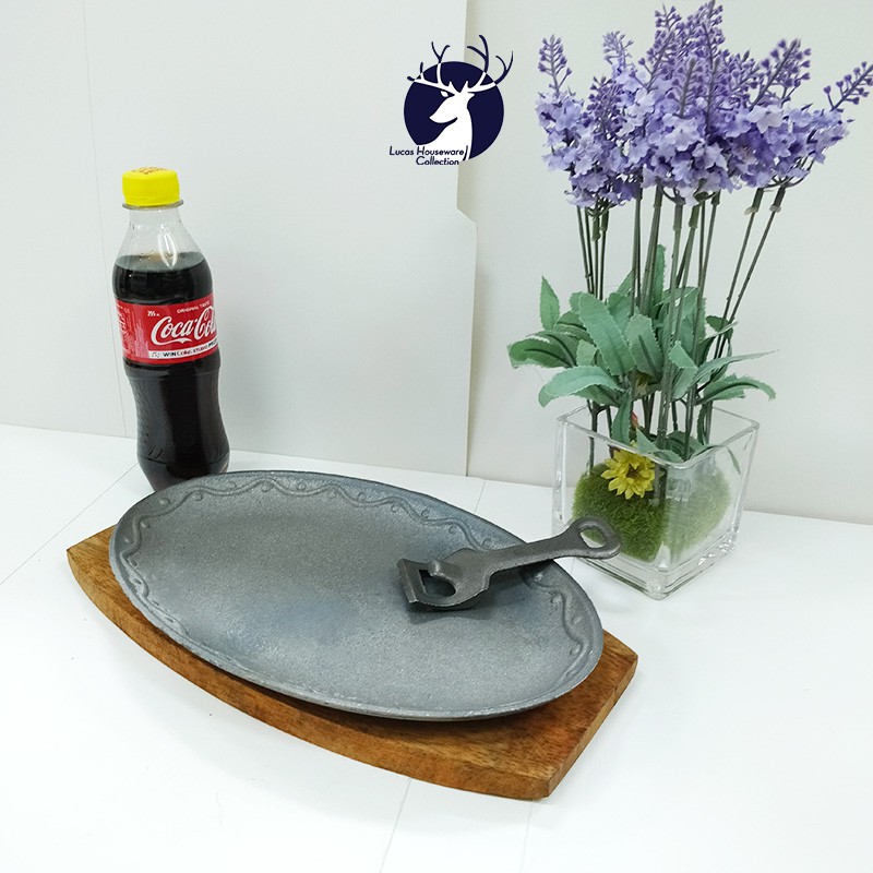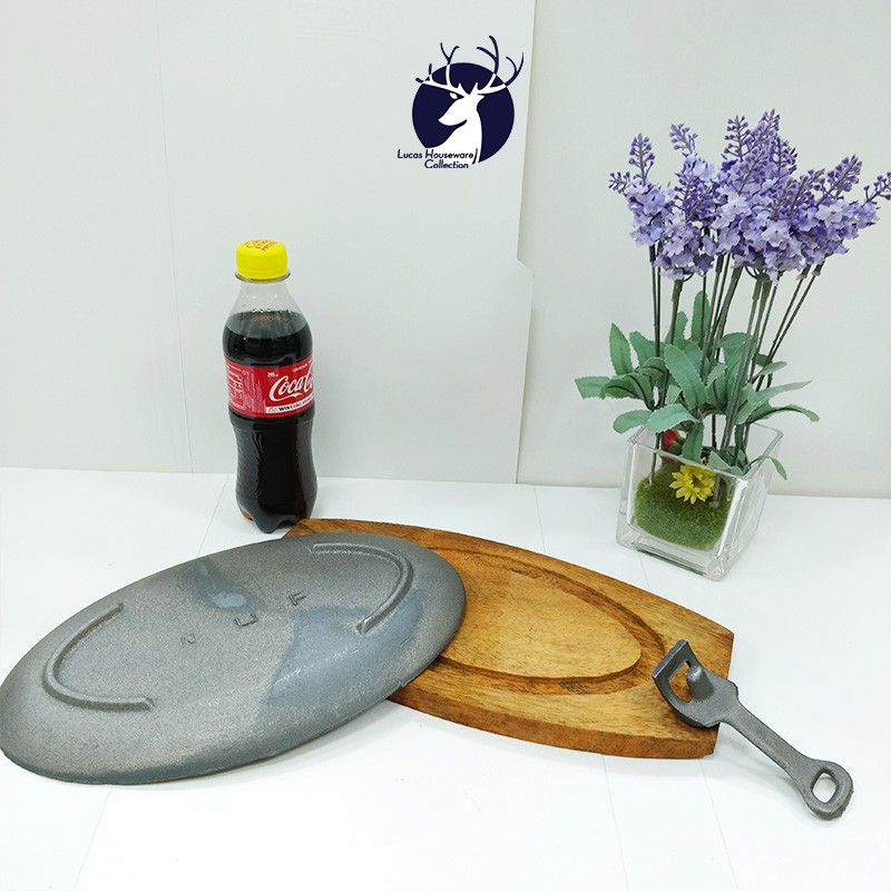 SIZZLING PLATE IN CAST IRON WITH WOODEN BASE WITH HANDLE / SIZZLING SISIG/ SILOG PLATE / ARABIC