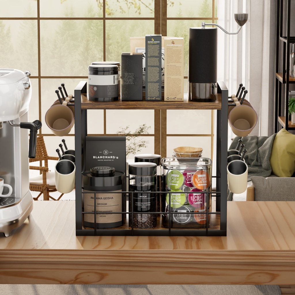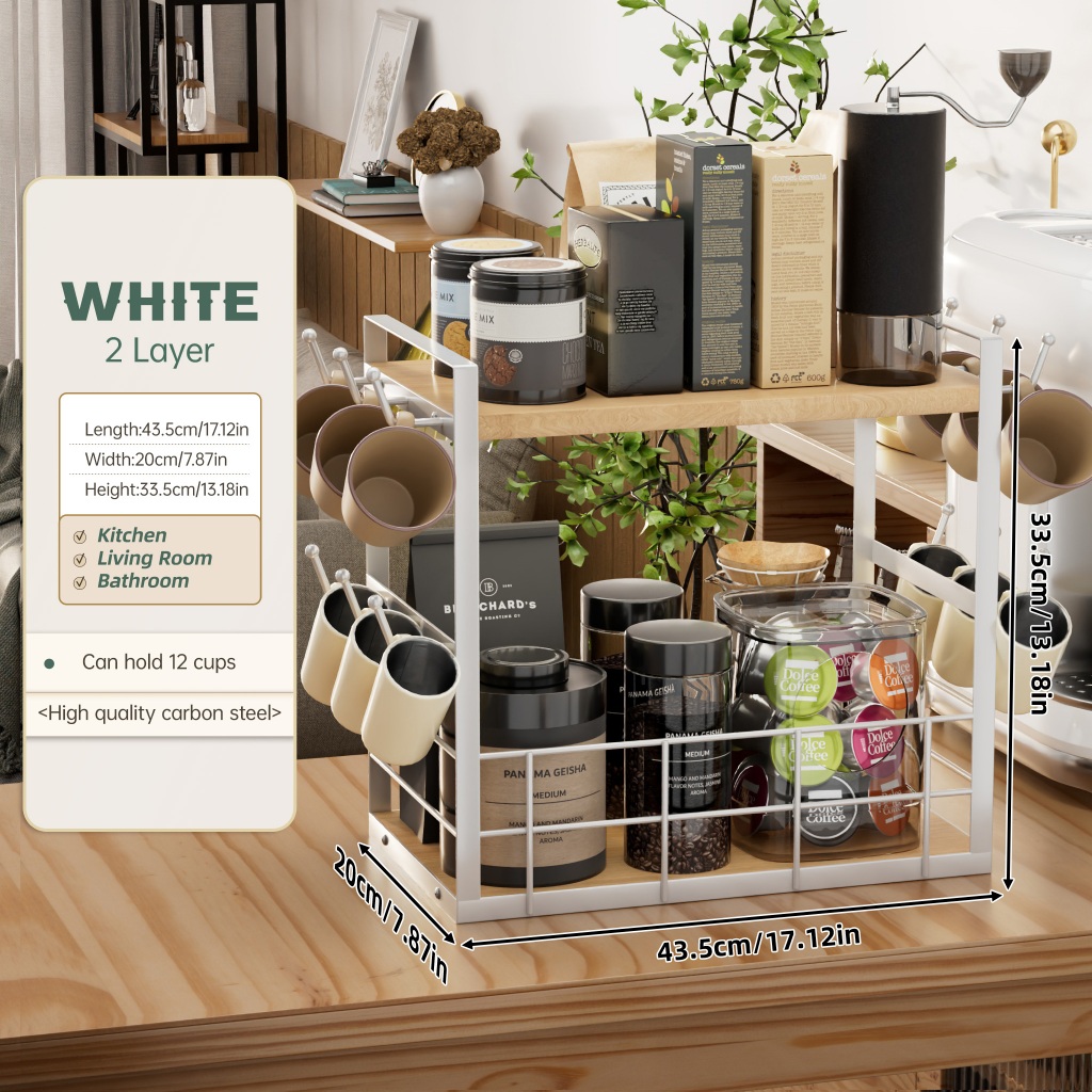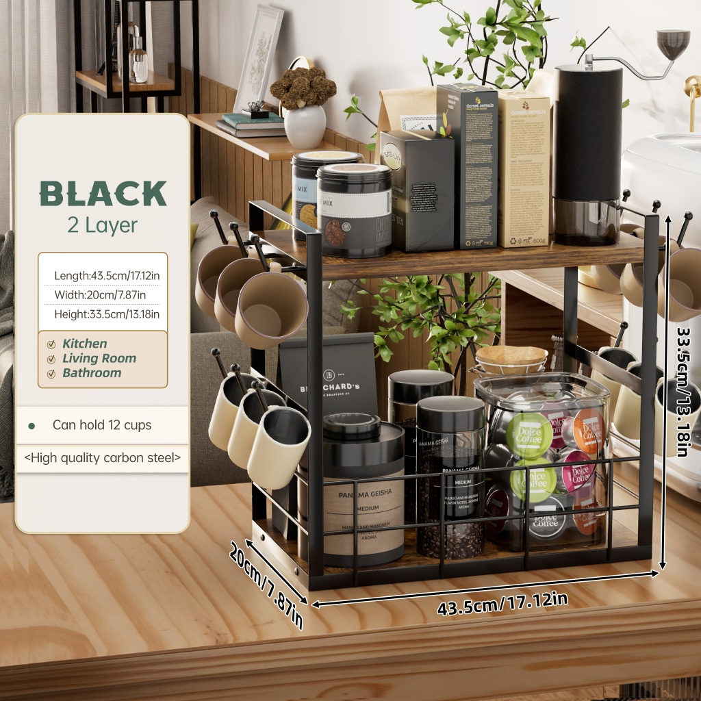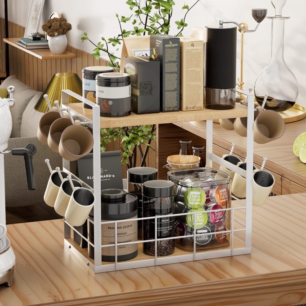 SJ Coffee Storage Rack Tea Bag Organizer 2 Tier Hangable Coffee Cup Organizer Metal Wooden Mug Rack
