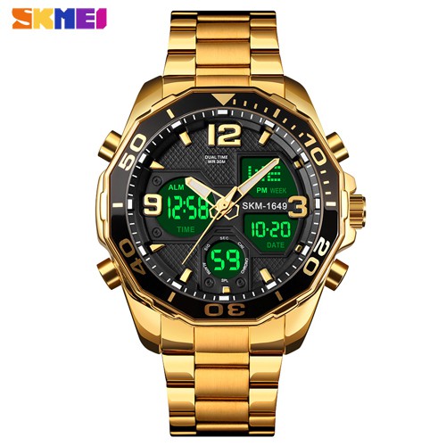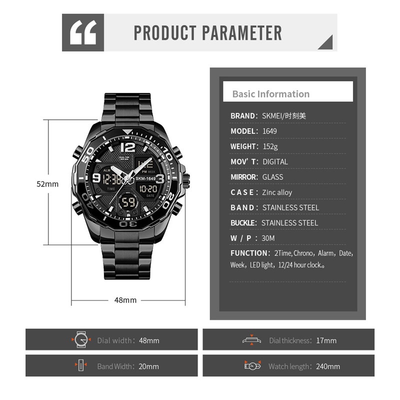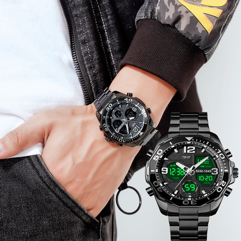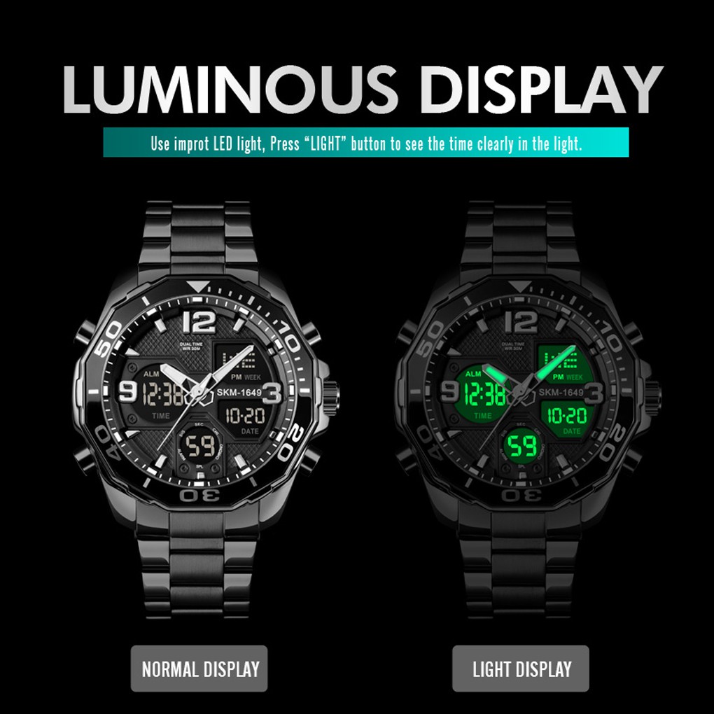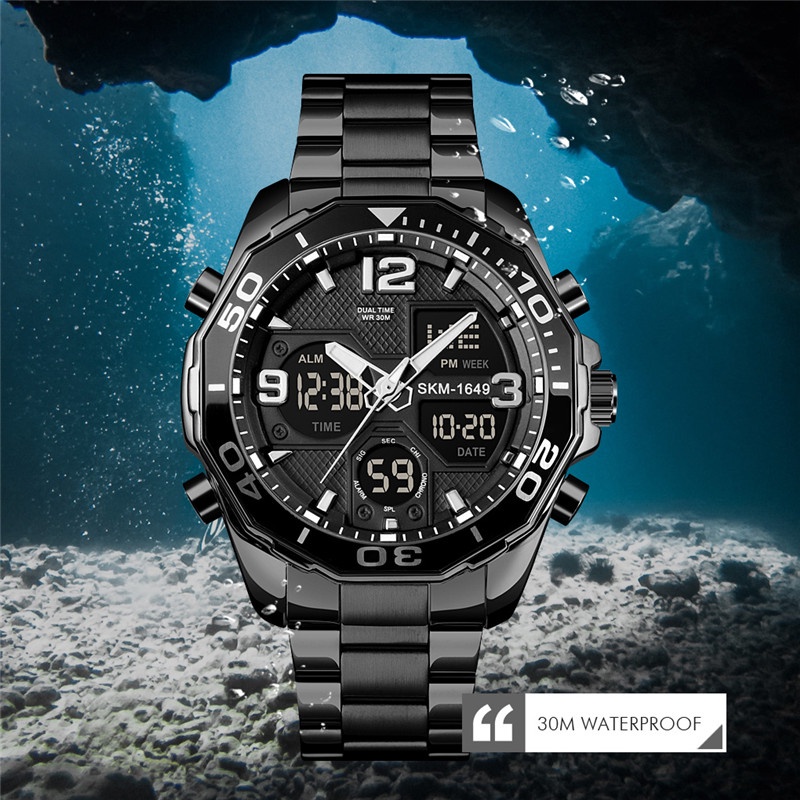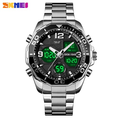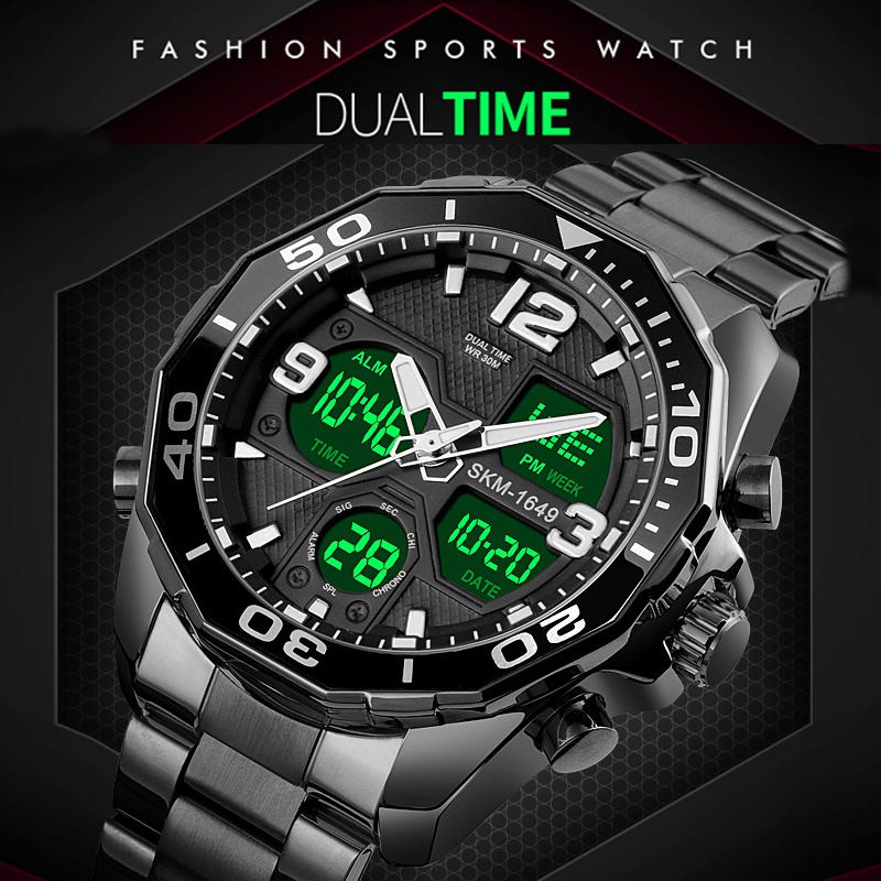SKMEI Dual Time for Man Luxury Stainless Steel Strap Rotatable Dial Digital Sports Watch 30M Waterproof Quartz LED Chronograph Wristwatch 12/24 hour Display