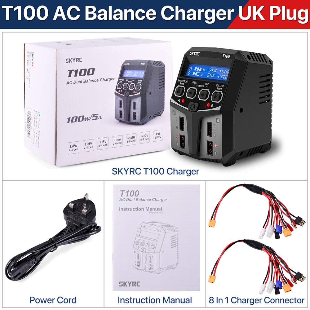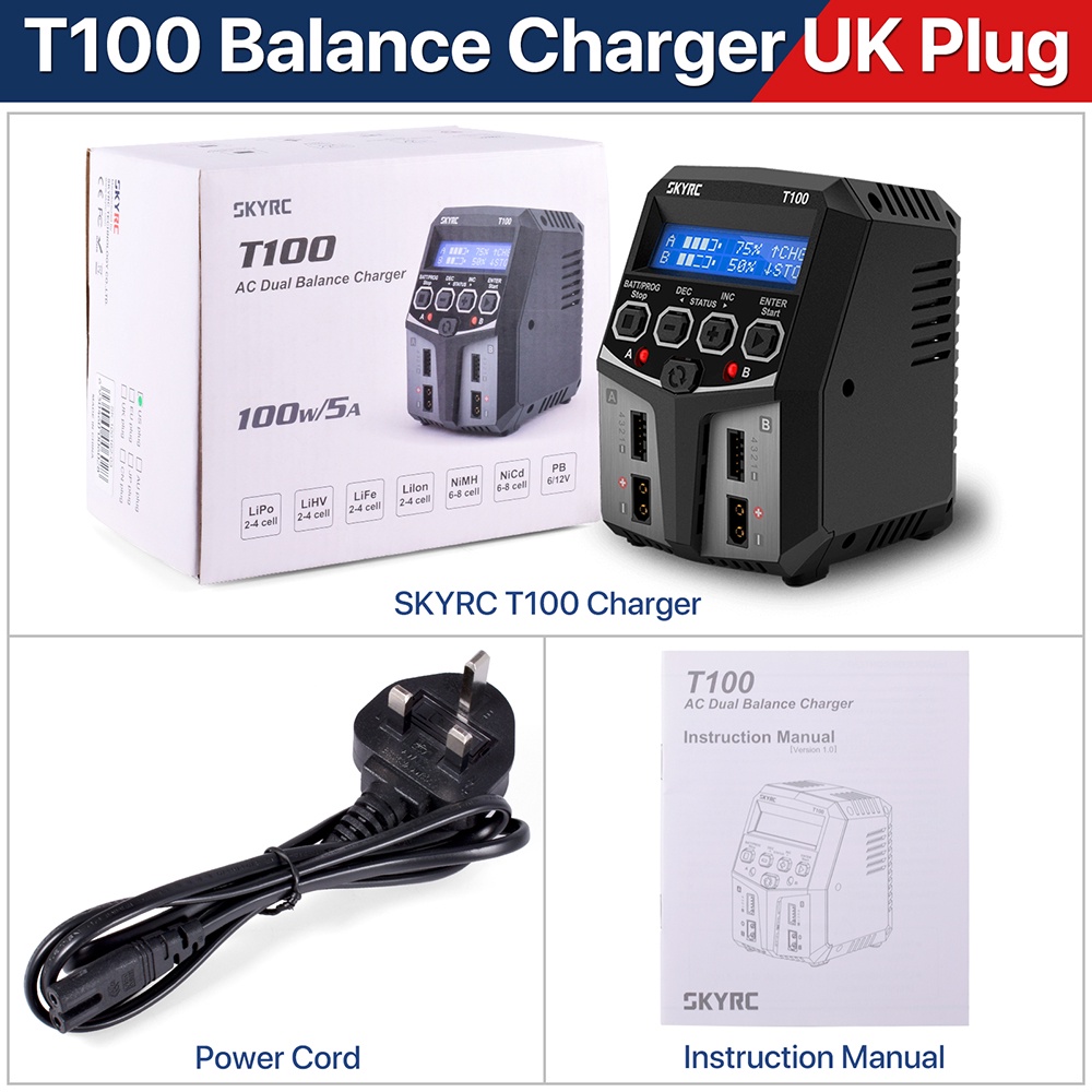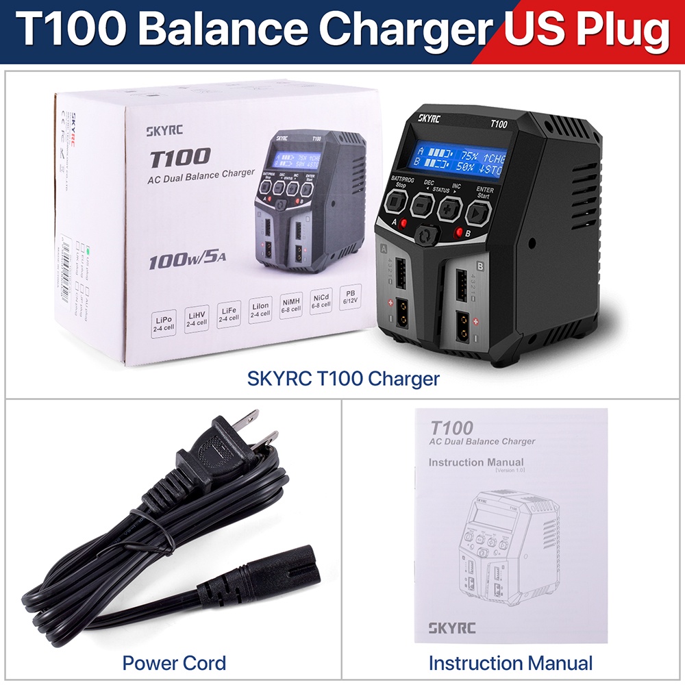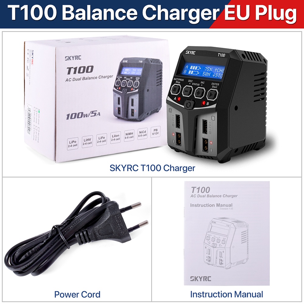 SKYRC T100 AC Lipo Battery Balance Charger Dual 5A 2X50W 2-4S Charger for NiMH / NiCd / LiPo / LiFe / Lilon / LiHV / Pb battery