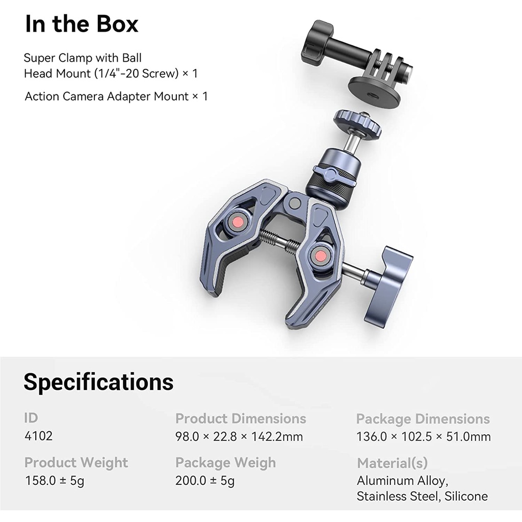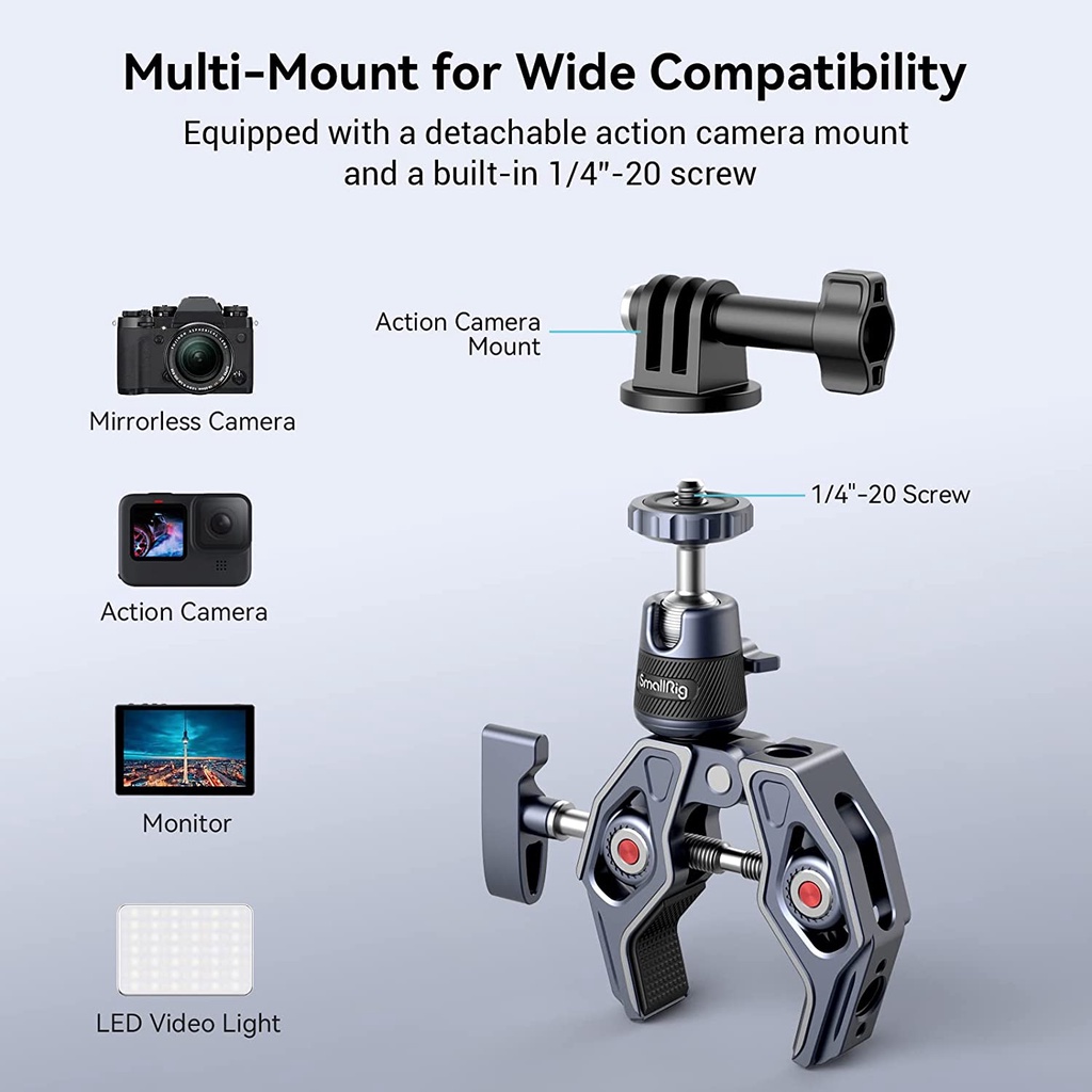 SMALLRIG Super Clamp with Ballhead, Camera Mount Clamp, Quick Release Adapter for Gopro, Camera Monitor, LED Light, Max Load 3.5KG - 4102