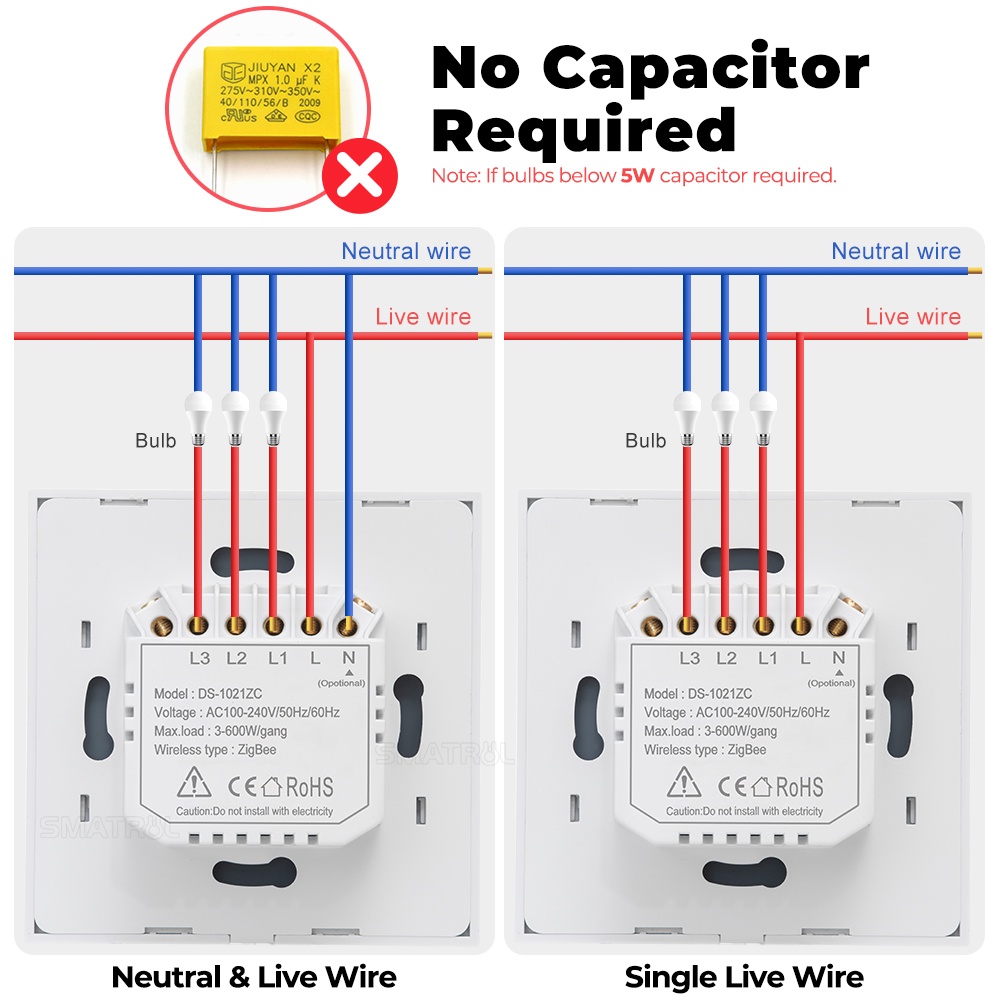 SMATRUL Tuya Zigbee Smart Push Switch Light No Neutral Wire Capacitor 1 2 3 Gang Eu 110v-240v Wall On Off Magnetic Latching Relay Electrical For Alexa Google Home Life