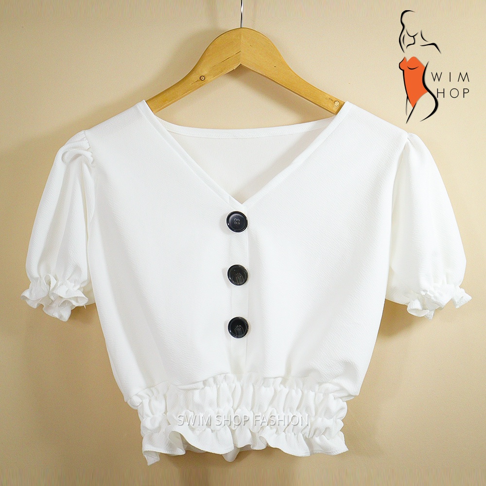 SS JULIA Plain Plaid Smocking Croptop with Button Down Design Tops Short Sleeve Crop