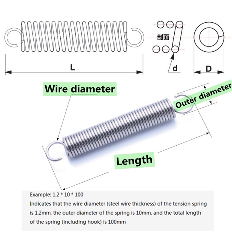 SUS304 Tension spring wire diameter 1.2mm OD10mm length 30-300mm tension spring open/closed hook