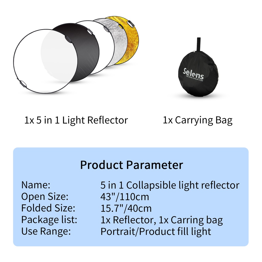 Selens Photography Reflector 5in1 Light Mulit Collapsible Disc for Studio Photo Disc Outdoor Reflective