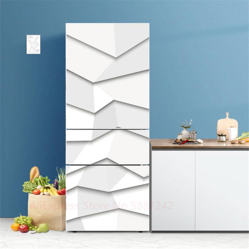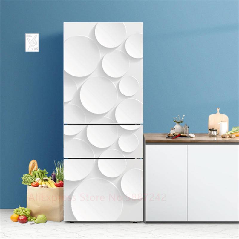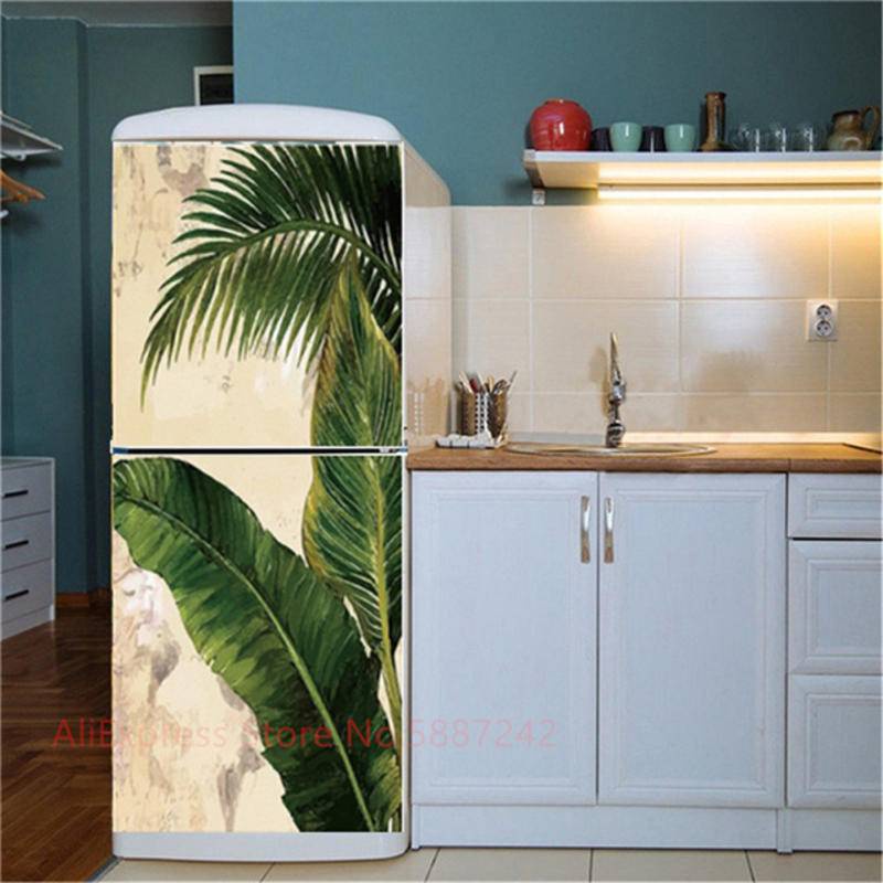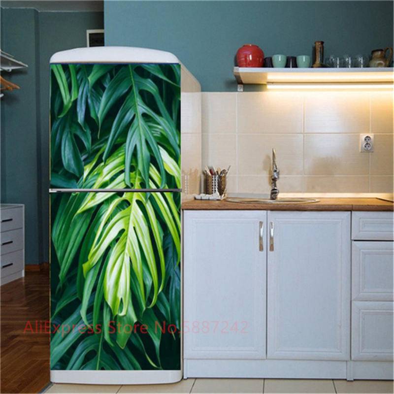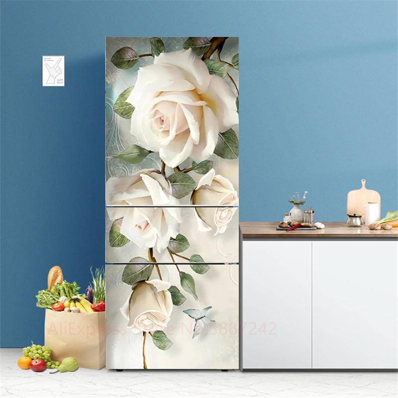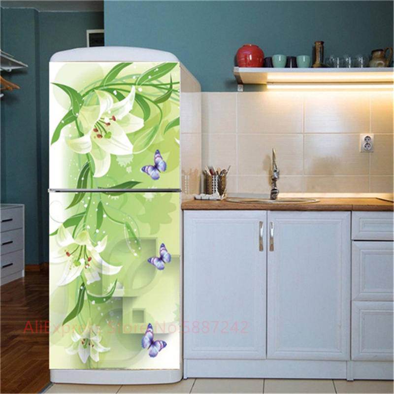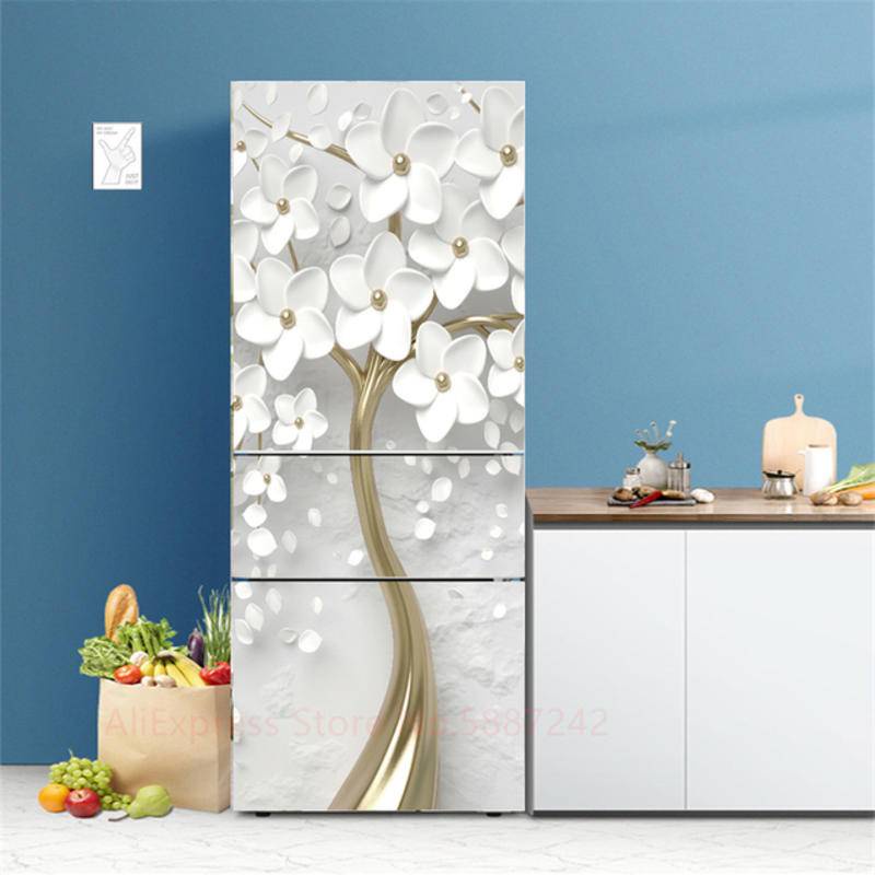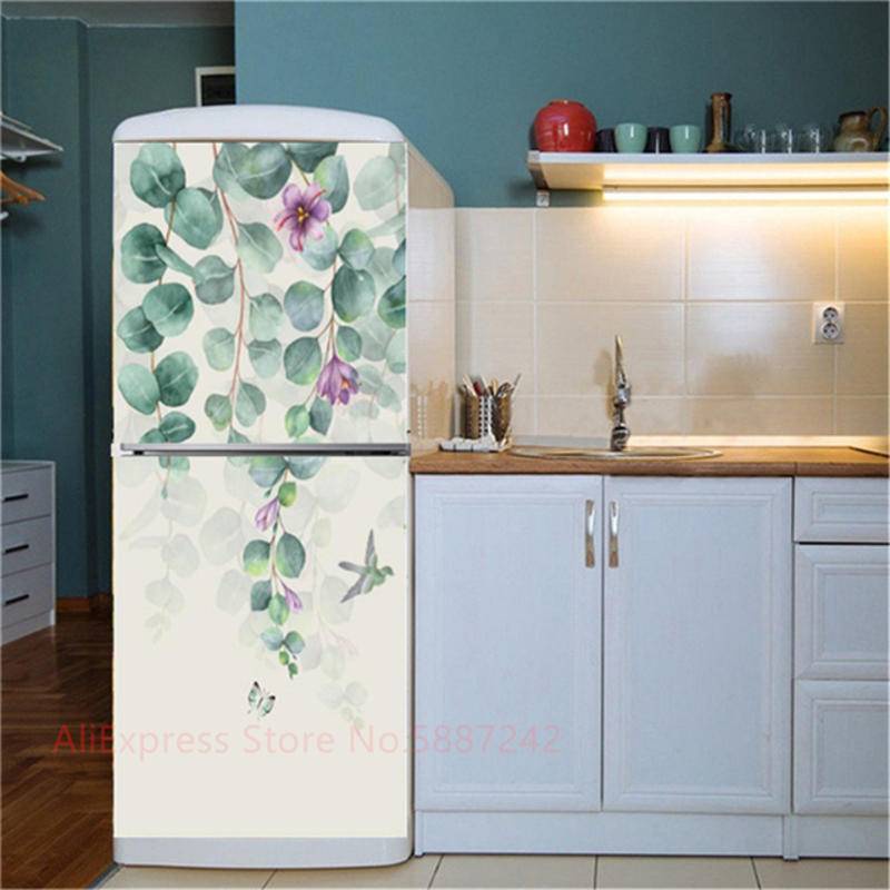 Self-adhesive Sticker On The Fridge Door Cover Decorative Film Kitchen Refrigerator Wallpaper White Flower Decal Green Full Wrap