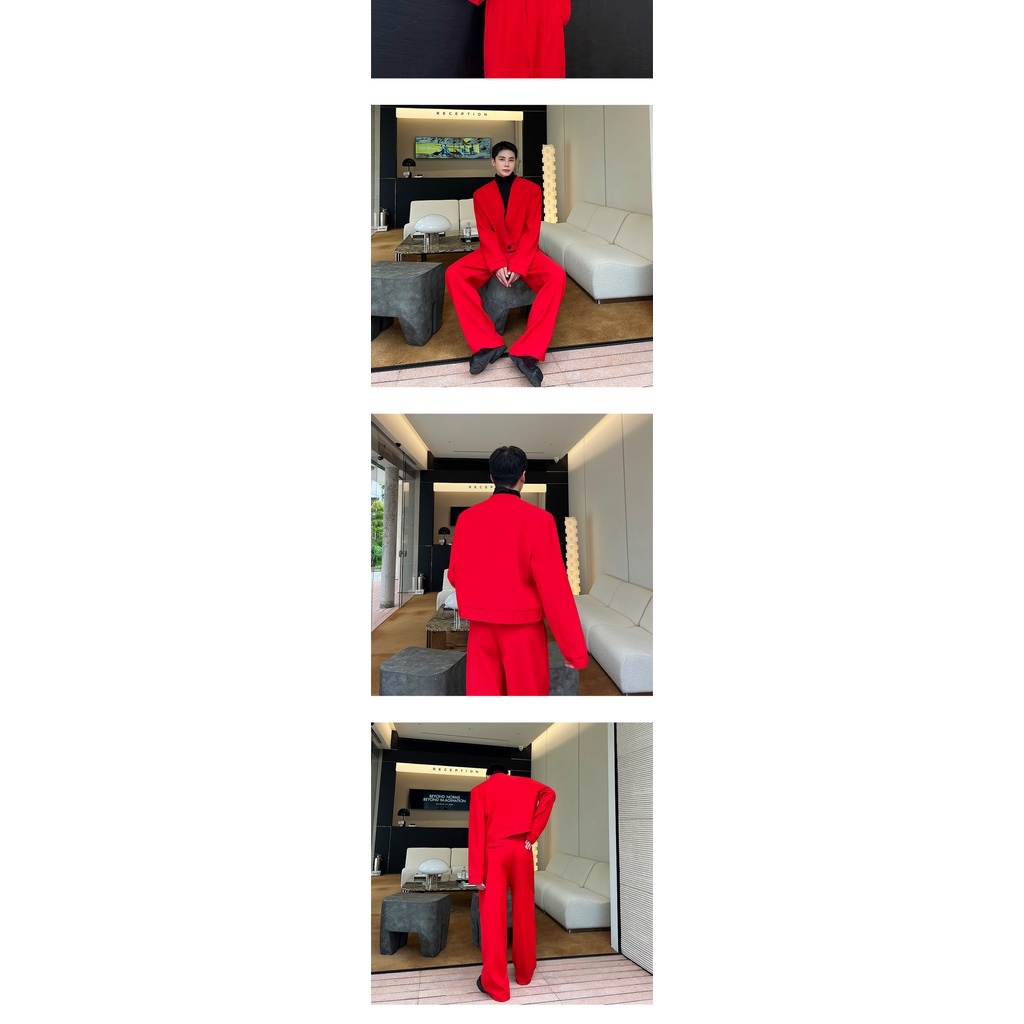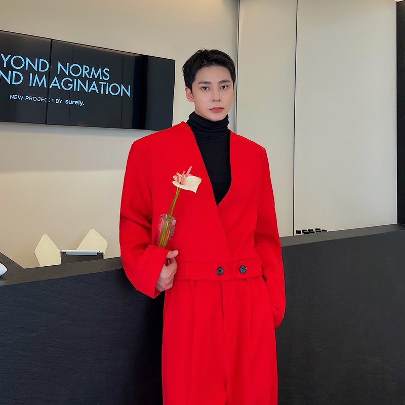 September New Style Spring Autumn Red Suit Jacket Men's High-End Street Wear Ruffian Handsome Fried Street Korean Version Chinese Red V-Neck Short Suit
