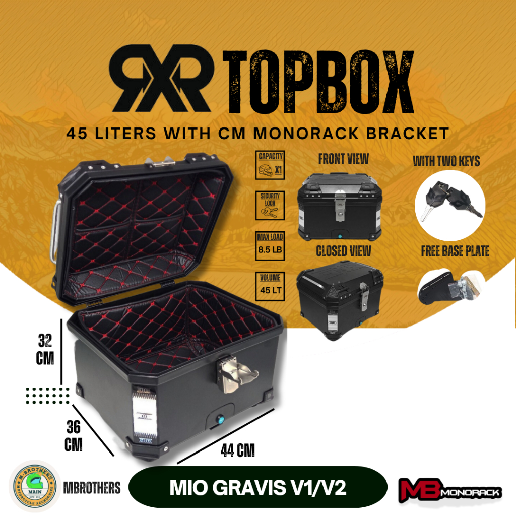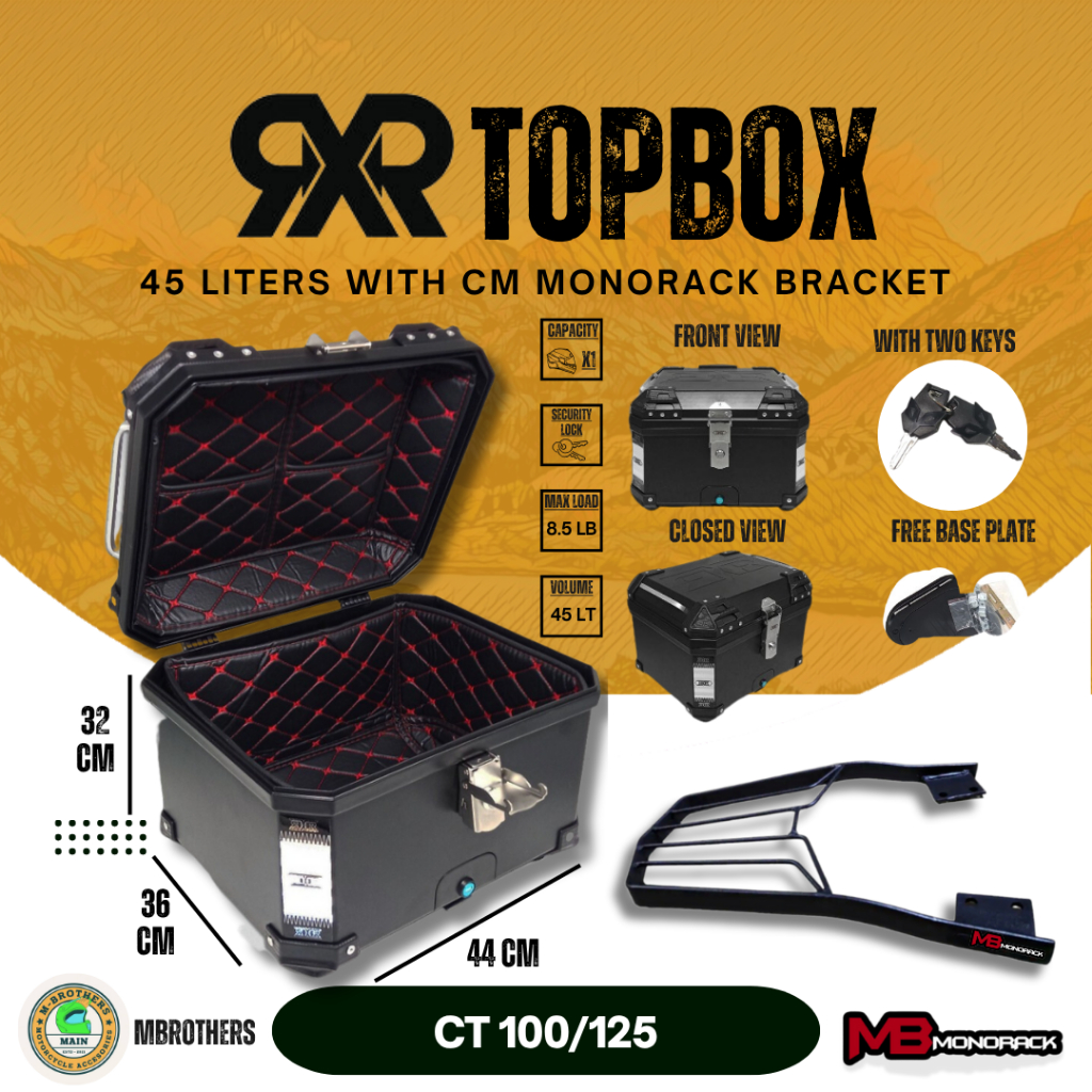 Set Black RXR 45 Liters Hard Plastic Top Box Helmet Compartment With MB Monorack Bracket
