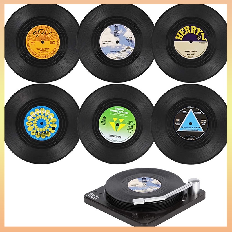 Set Of 6 Coasters For Drinks Music Coasters With Vinyl Record Player Holder Retro Record Disk Coaster Mug Pad Mat Creative