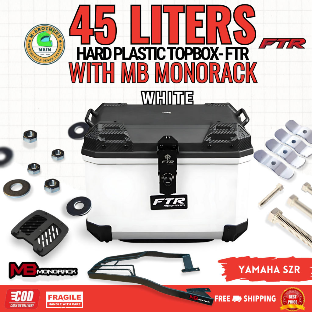 Set White FTR 45 Liters Single Lock Hard Plastic Top Box Helmet Compartment With MB Monorack