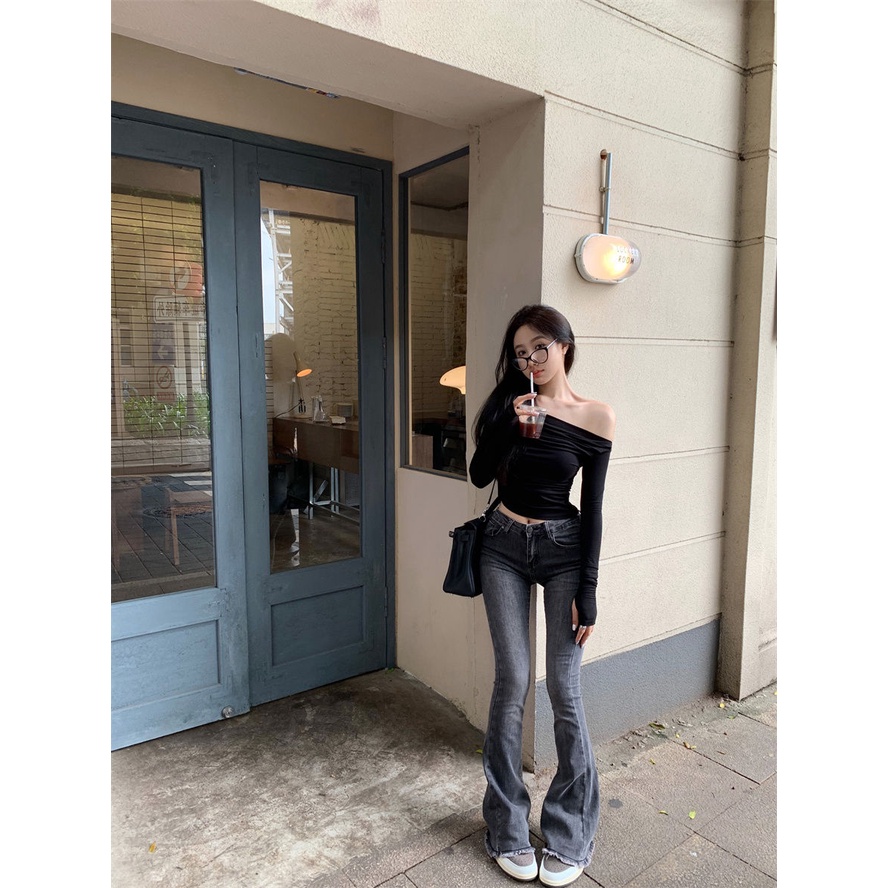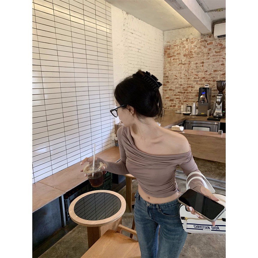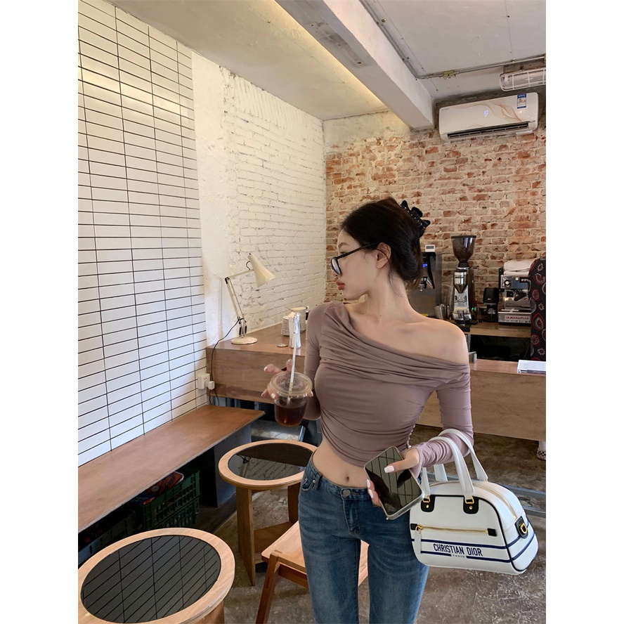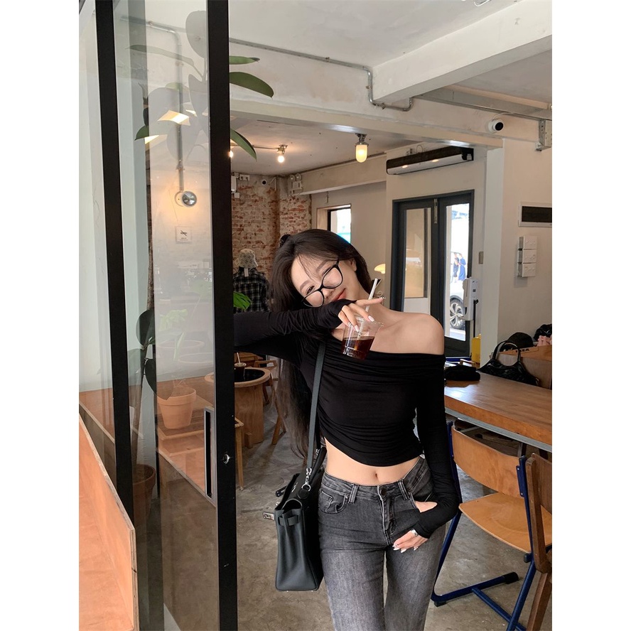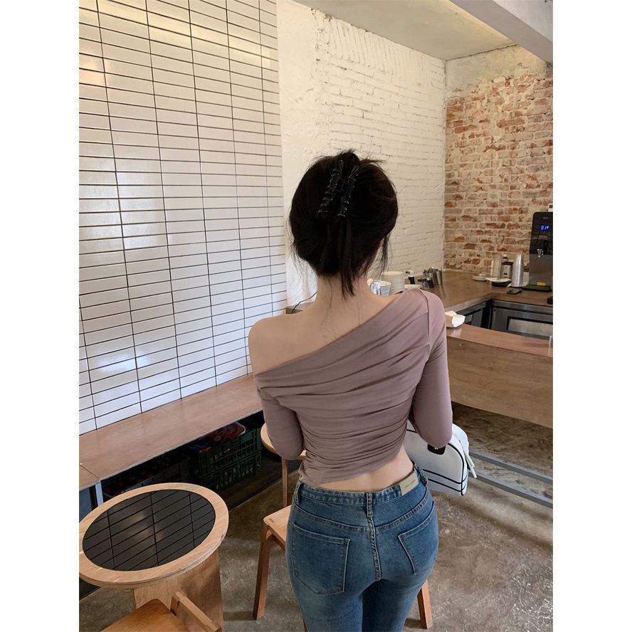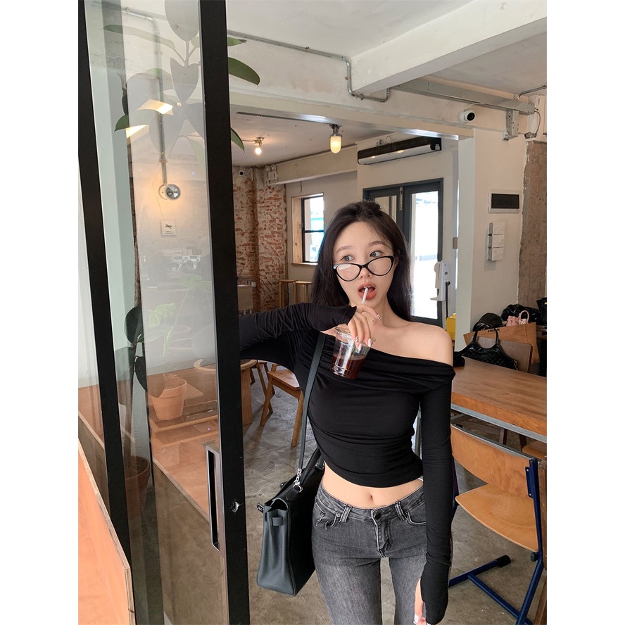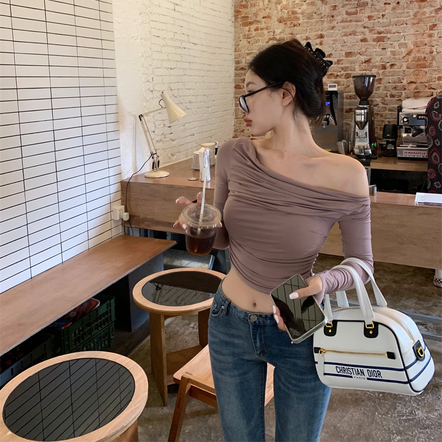 Short off shoulder long sleeve blouse pleat shirt Korean knit tops