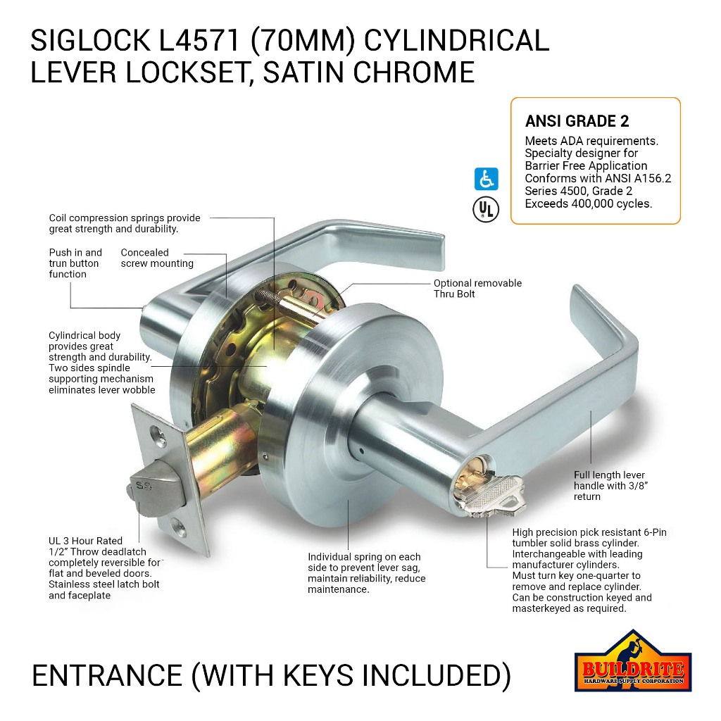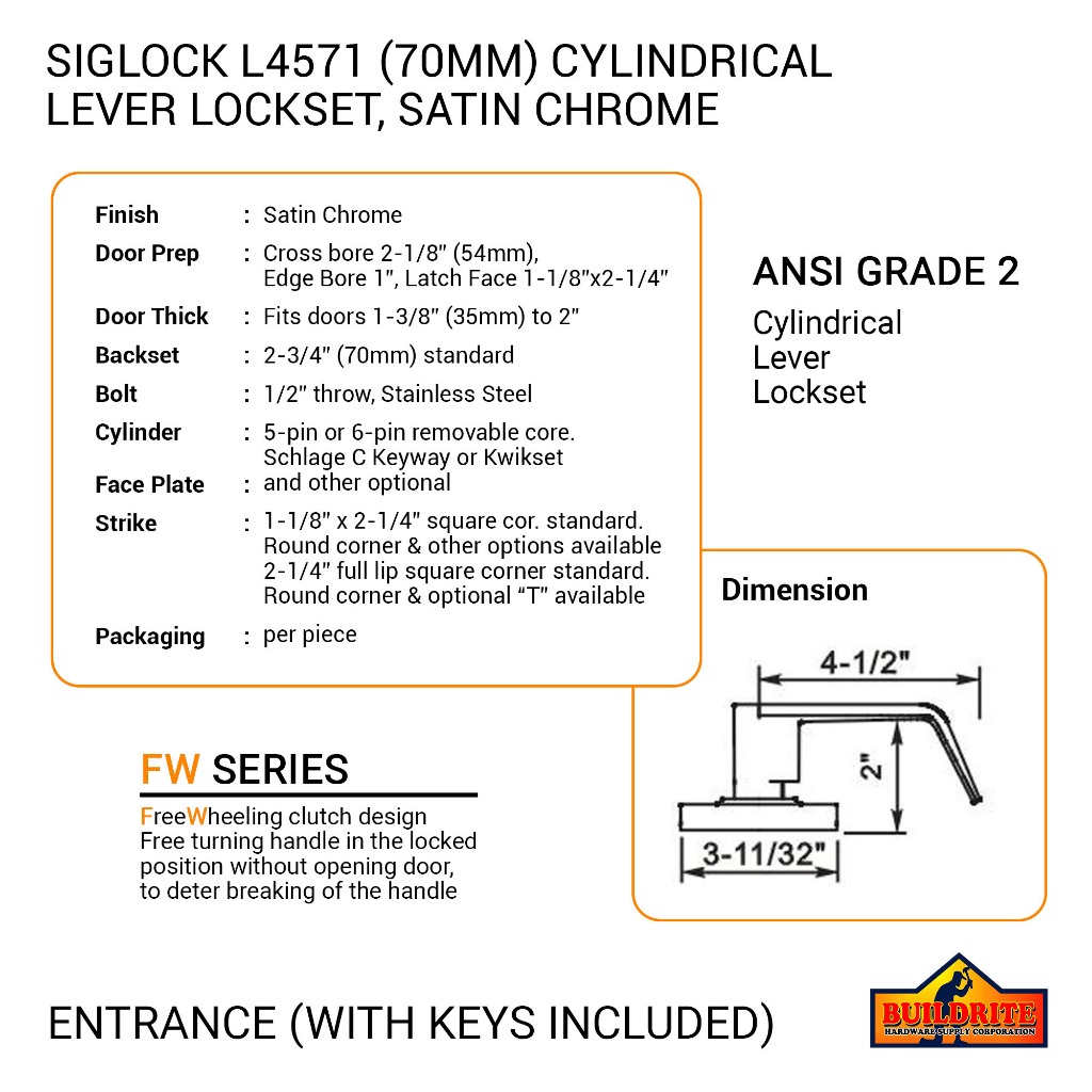Siglock SLG.L4571.SC.ET (70MM) Entrace Lock ANSI Grade 2 Cylindrical Lever Lockset Satin Chrome