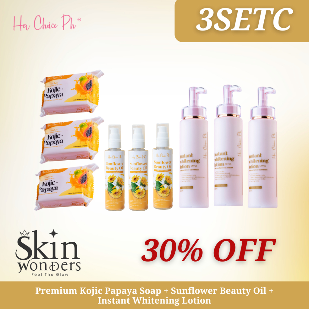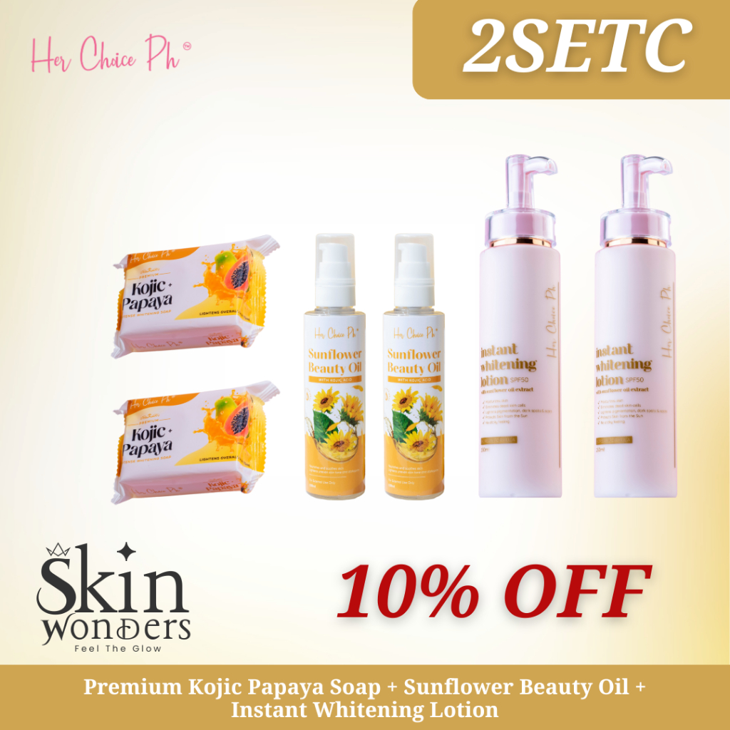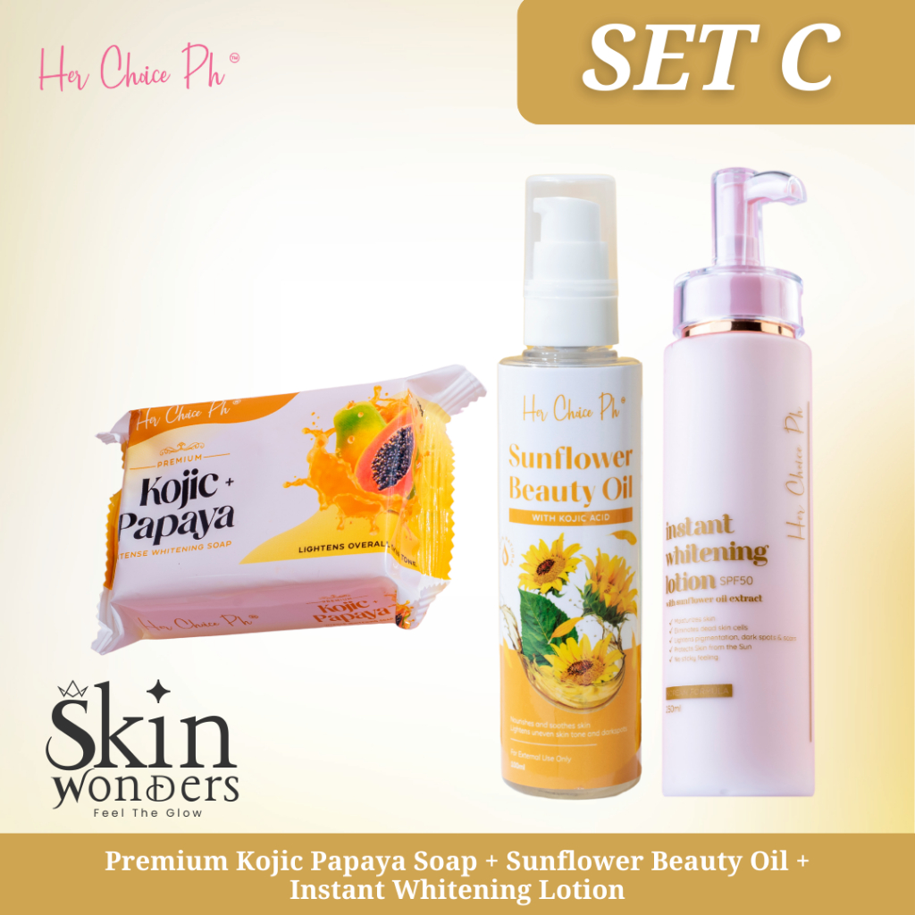 Her Choice PH Whitening Combo Set: Kojic Papaya Soap, Instant Whitening Lotion SPF50 & Sunflower Oil