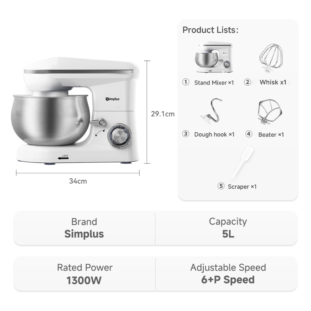 Simplus Stand Mixer 5L Professional Classic Mixer 2mins Quick Mixing For 5-8 People