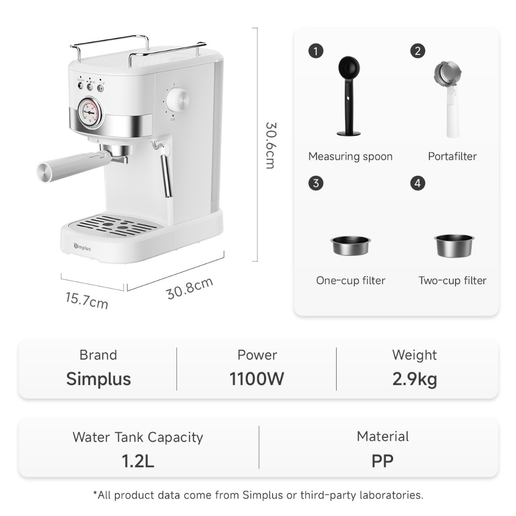 Simplus Coffee Maker Semi Automatic Espresso Extraction 15Bar High Pressure 1.2L Water Tank