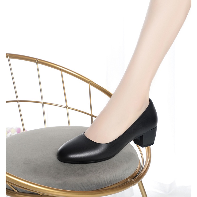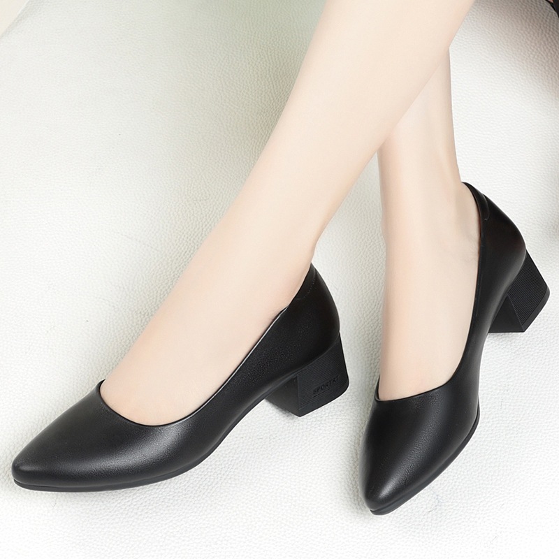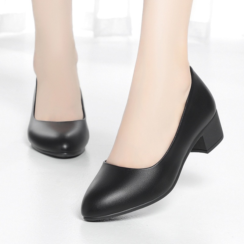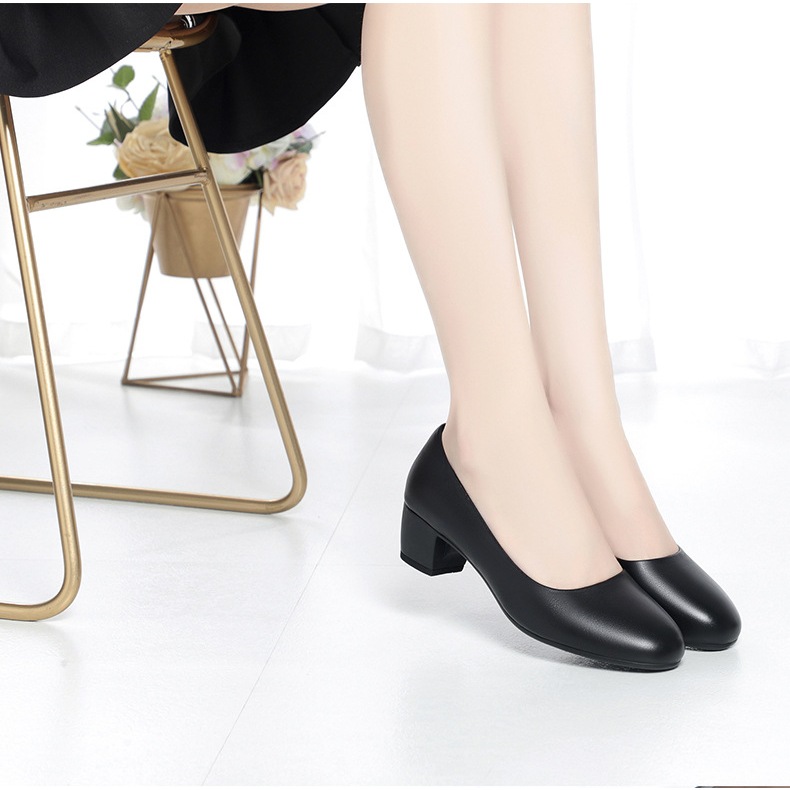 Size 35-40 Women's Leather Shoes Flight Attendant Black Thick Heel Work Shoes Medium Heel High Heels