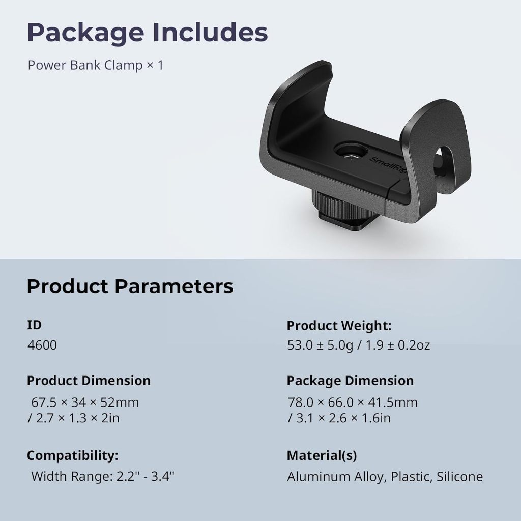 SmallRig Power Bank Holder with Cold Shoe Mount, Power Bank Clamp Mount, Adjustable Power Bank Clamp for Camera rig and Phone Cage 4600
