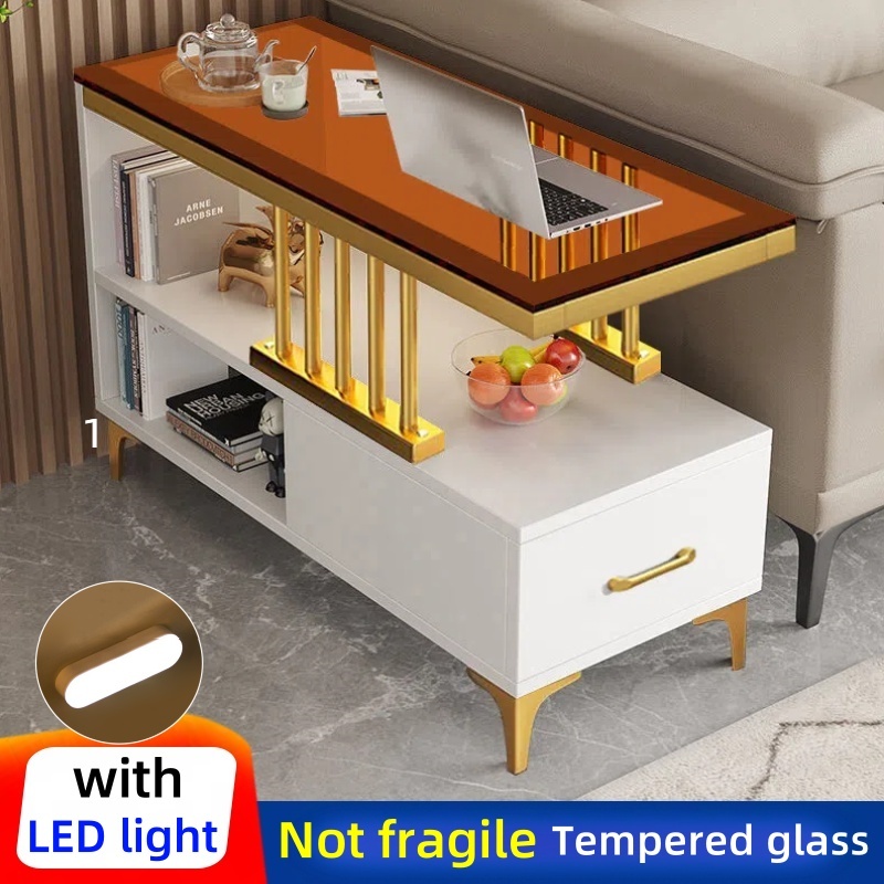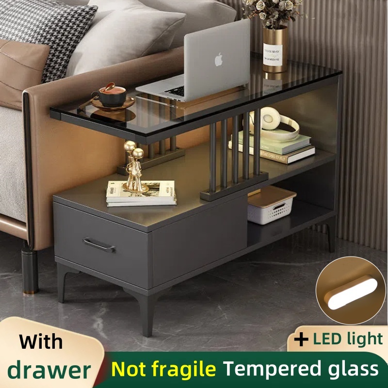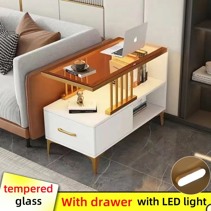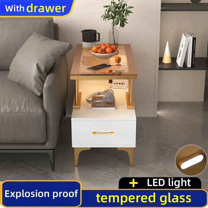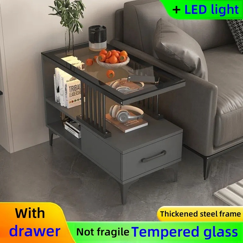 Sofa Side Table Living Room Side Cabinet With Drawer LED Coffee Table Glass Center Table Tea Table